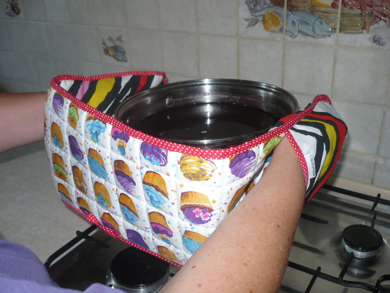 Ostatnim i jak dla mnie genialnym produktem, jest podwójna łapka kuchenna. Nie ma obawy, że się poparzymy, przenosząc na przykład garnek z zupą. Koniec z poszukiwaniem i parowaniem rękawic kuchennych. Jest wygodna w użytku, łatwo wkłada się w nią ręce. Oprócz rąk chroni też klatkę piersiową i brzuch. Posiada poręczny wieszaczek. Wyróżnia ją oryginalny wzór. Z jednej strony ma kolorowe paski, a z drugiej babeczki. Z całą pewnością, będzie niezwykłą ozdobą każdej kuchni. Powiem szczerze, gdyby nie przypięta kartka, nie wiedziałabym, do czego to służy. Dla mnie jest to innowacyjne i nowoczesne rozwiązanie.