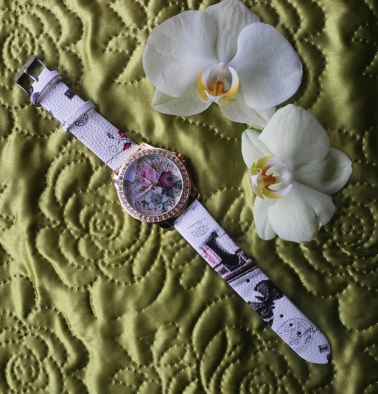 Zamówiony zegarek przeszedł moje najśmielsze odczekiwania. Posiada biały, regulowany pasek z drobnymi kwiatami, pieczątkami , motylem i łukiem triumfalnym. Jego tarcza jest złota i ozdobiona drobnymi cekinami. W środku wizerunki trzech kwiatów, a w ich tle teksty pisane piórem. Zarówno cyfry, jak i wskazówki zegara, są złote. Zegarek jest bardzo gustowny i wygląda cudownie. Myślę, że może być doskonałą ozdobą i każda kobieta ucieszyłaby się z takiego prezentu. Ja na pewno. Dla mnie to kolejny doskonały produkt. Są to bransoletki rhinestone.