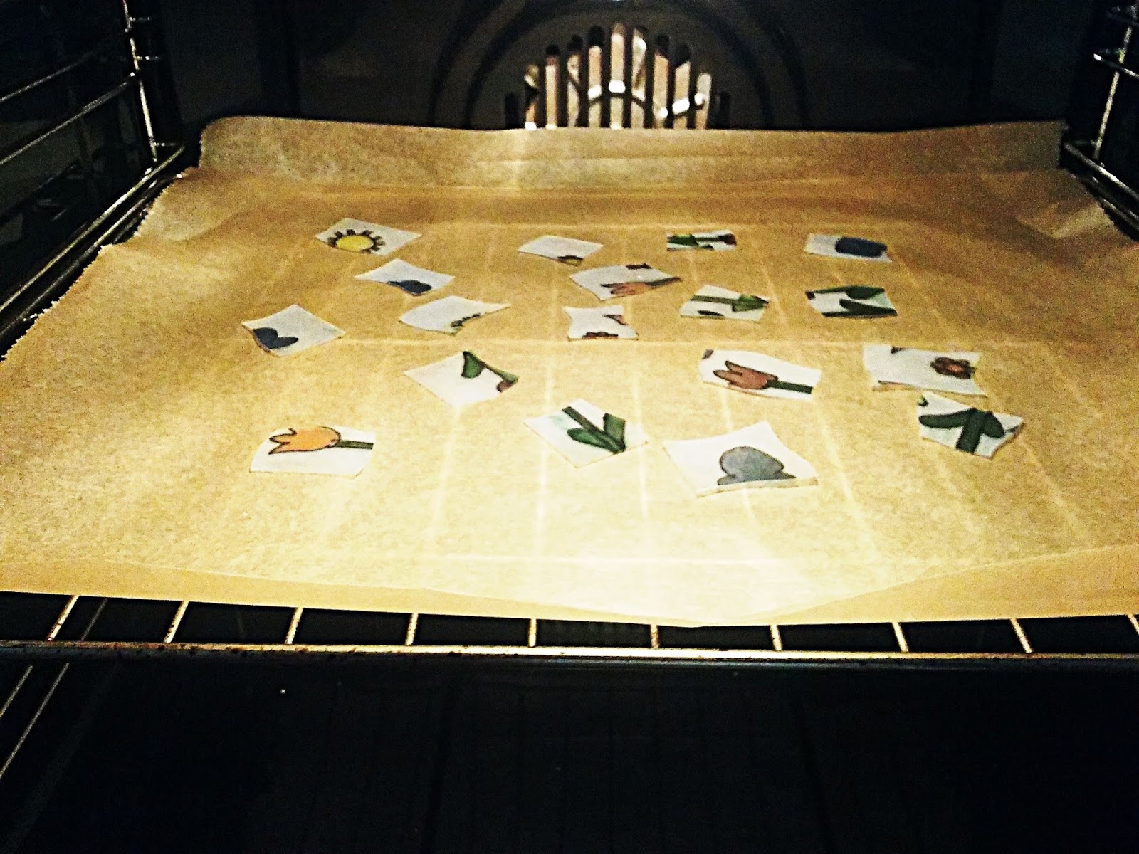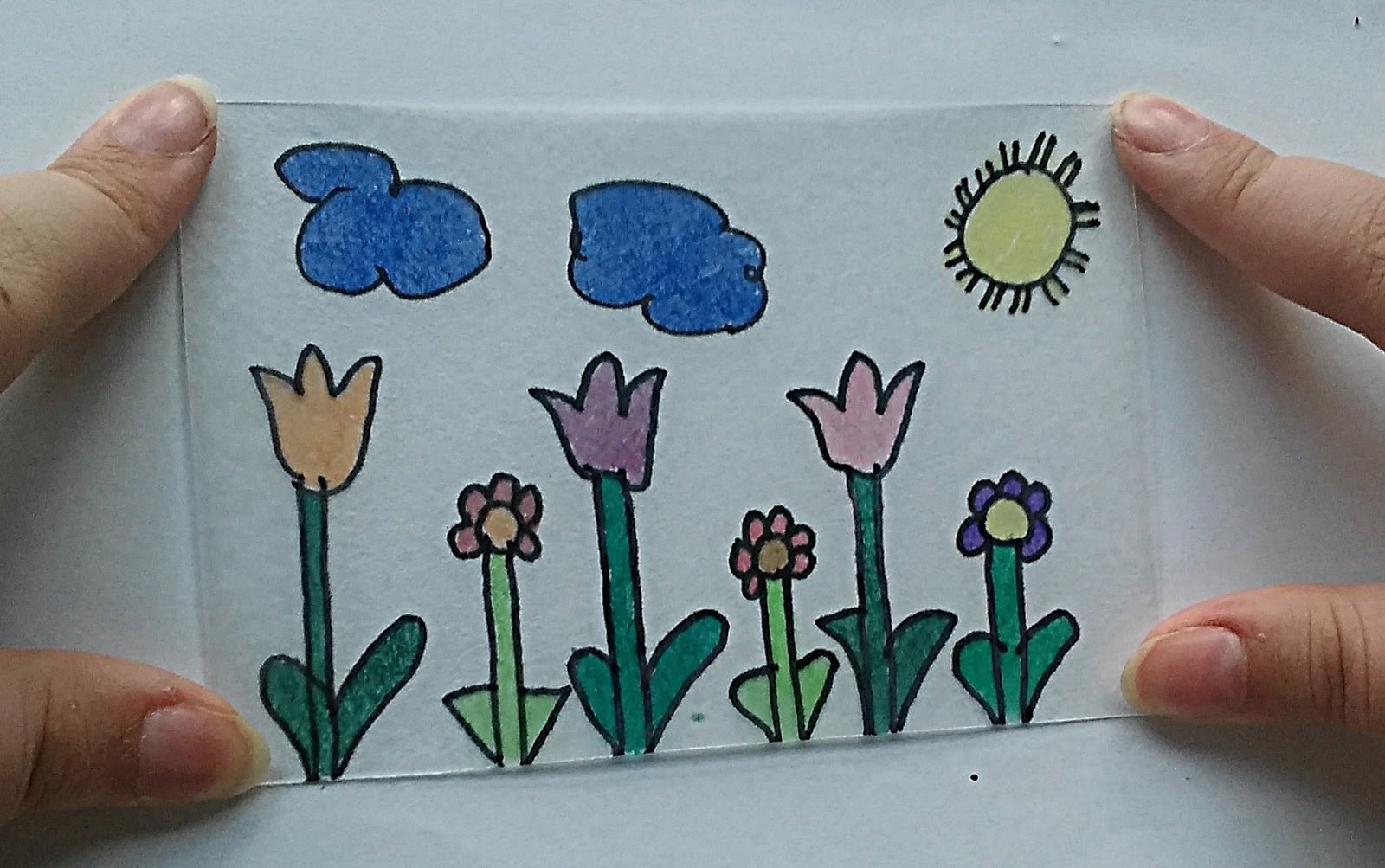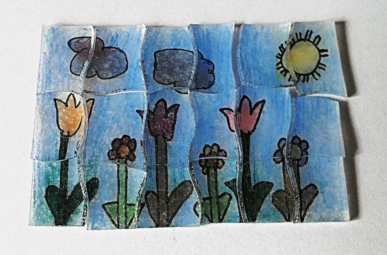 Ten eksperyment miał na celu wyjaśnienie, co to znaczy, że folia jest termokurczliwa. Na początek zadaniem dziecka jest narysowanie na matowej stronie folii dowolnego wzoru pisakiem permanentnym. Później można go pokolorować mazakami lub kredkami, z wyjątkiem kredek świecowych. Gdy nasz obrazek jest już gotowy, musimy go pociąć na kawałki, takie jak puzzle. Należy jednak pamiętać, aby ich kawałki nie były zbyt małe. Teraz potrzebna jest pomoc kogoś dorosłego. Należy puzzle włożyć na 3 minuty do piekarnika rozgrzanego do 160 stopni. Po upływie czasu należy je wyjąć i odczekać 15 minut, aż ostygną. Układanka gotowa! Puzzle zmniejszyły się, ale stały się grubsze. W tym eksperymencie warto policzyć skalę i porównać, jak zmniejszyły się ich wymiary. W naszym przypadku skala wyniosła 1:2,3.