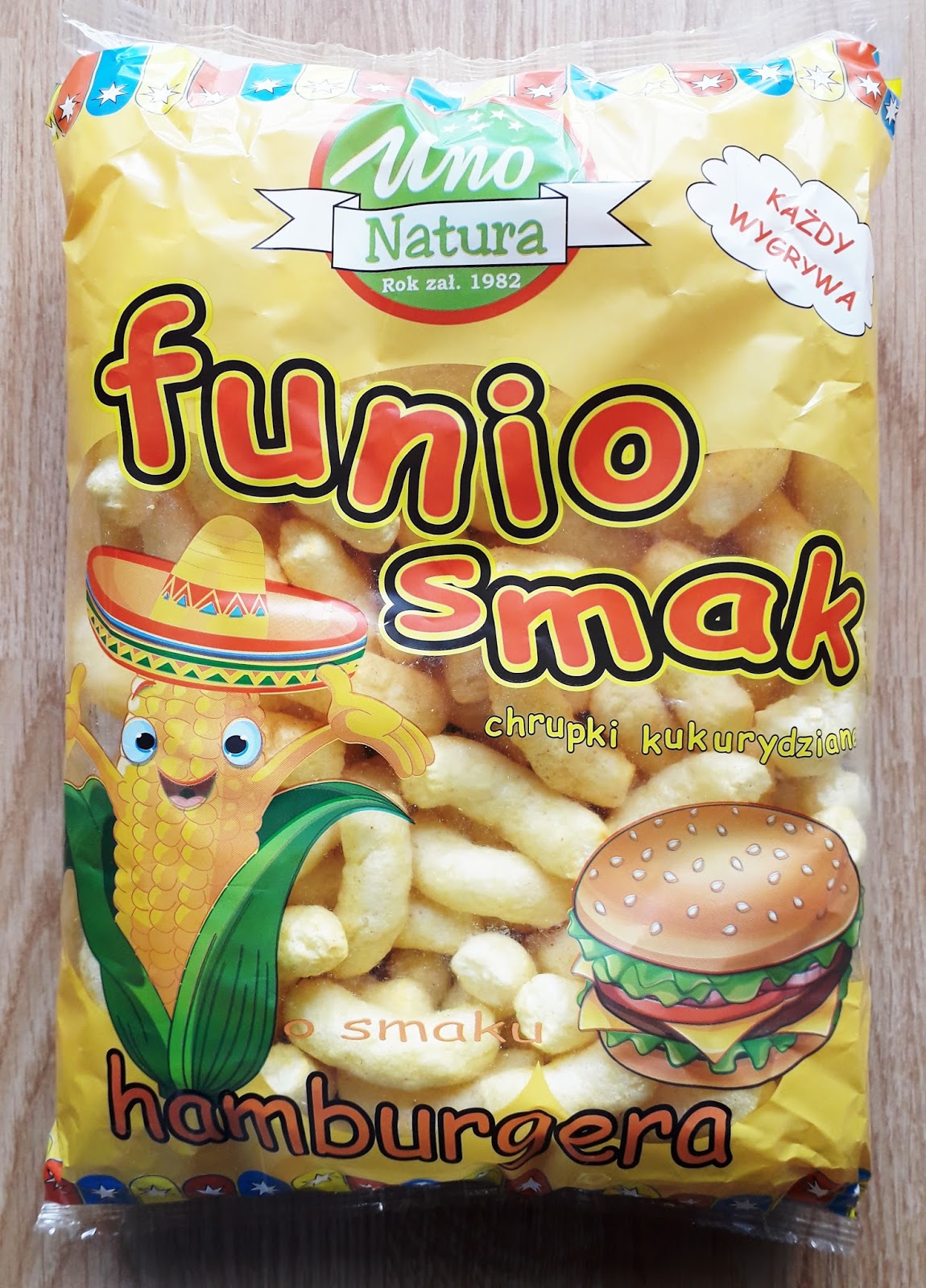 Zacznę może od chrupków kukurydzianych Funio o smaku hamburgera. Skład: kasza kukurydziana, olej rzepakowy, posypka o smaku hamburgera, przyprawy (m.in. czosnek), cukier, sól, wzmacniacze smaku: E621, E609, musztarda w proszku (zawiera gorczycę), hydrolizat białka roślinnego (zawiera soję), regulator kwasowości: E330, aromaty. Wyglądem przypominają zwykłe flipsy, jednak gdy weźmiemy je do ust, poczujemy delikatny, ostry smak hamburgera. Są bardzo chrupkie. Swoim oryginalnym smakiem podbiją serce niejednego smakosza. Doskonale sprawdzą się na przyjęciach urodzinowych, czy Sylwestrze. Idealna i bardzo oryginalną przekąską. Nigdy dotąd takich nie jadłam.