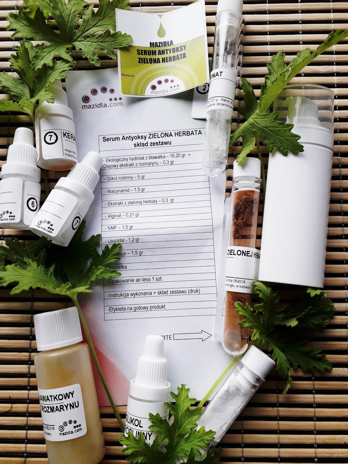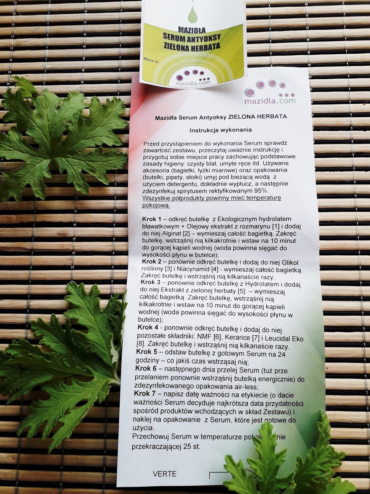 Do samodzielnego wykonania serum otrzymujemy zestaw odmierzonych składników, każdy w osobnej fiolce, wraz z buteleczką z pompką na gotowy produkt i instrukcją. W tym przypadku wykonanie kosmetyku jest dużo bardziej pracochłonne. W trakcie „produkcji” serum dwukrotnie trzeba umieścić część składników w kąpieli wodnej, by je podgrzać, co pozwala na dokładne ich wymieszanie. Po tym kroku zostawiamy serum na 24 godziny, od czasu do czasu je wstrząsając, i dopiero po tym czasie przelewamy je do opakowania air-less. W efekcie otrzymujemy beztłuszczowe Serum o lekkiej, żelowej konsystencji, bursztynowym kolorze i delikatnym, ziołowym zapachu. Mnie osobiście taki zapach bardzo się podoba i po zastosowaniu serum czuję się odświeżona. Samodzielne tworzenie kosmetyku przynosi mi wiele frajdy i satysfakcji. Dodatkowo mam pewność, że nie ma tam żadnych szkodliwych substancji. Serum ma lekką, dość wodnistą konsystencję. Szybko się wchłania i pozostawia skórę miękką i dogłębnie nawilżoną. Serum wygładza skórę, także małe zmarszczki. Bardzo łatwo się je aplikuje i może służyć jako baza pod krem nawilżający. Czujemy świeżość i odprężenie skóry. Serum jest matowe. Osobiście używam je po umyciu twarzy rano i wieczorem, w ciągu dnia czuję się doskonale, mimo warstwy makijażu. Można je kupić TUTAJ za 15zł. Jak dla mnie jest to dość niska cena, jak na produkt o tylu zastosowaniach. U mnie sprawdza się doskonale. Na pewno będę używać go dalej i zachęcam Was do poznania pozostałych produktów z oferty sklepu Mazidla.com. Polecam w 100%!