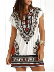 Druga tunika wygląda zupełnie inaczej. Ma biały kolor i krótki rękaw. Znajdują się na niej różnokolorowe, kwiatowe wzory, które nadają jej niezwykły charakter. Zróżnicowane kolory i wzory doskonale sprawdzą się w plażowej stylizacji. Myślę, że idealnie pasują do niej białe spodnie 3/4 i białe sandałki, płaskie lub na koturnie. Jest bardzo oryginalna.