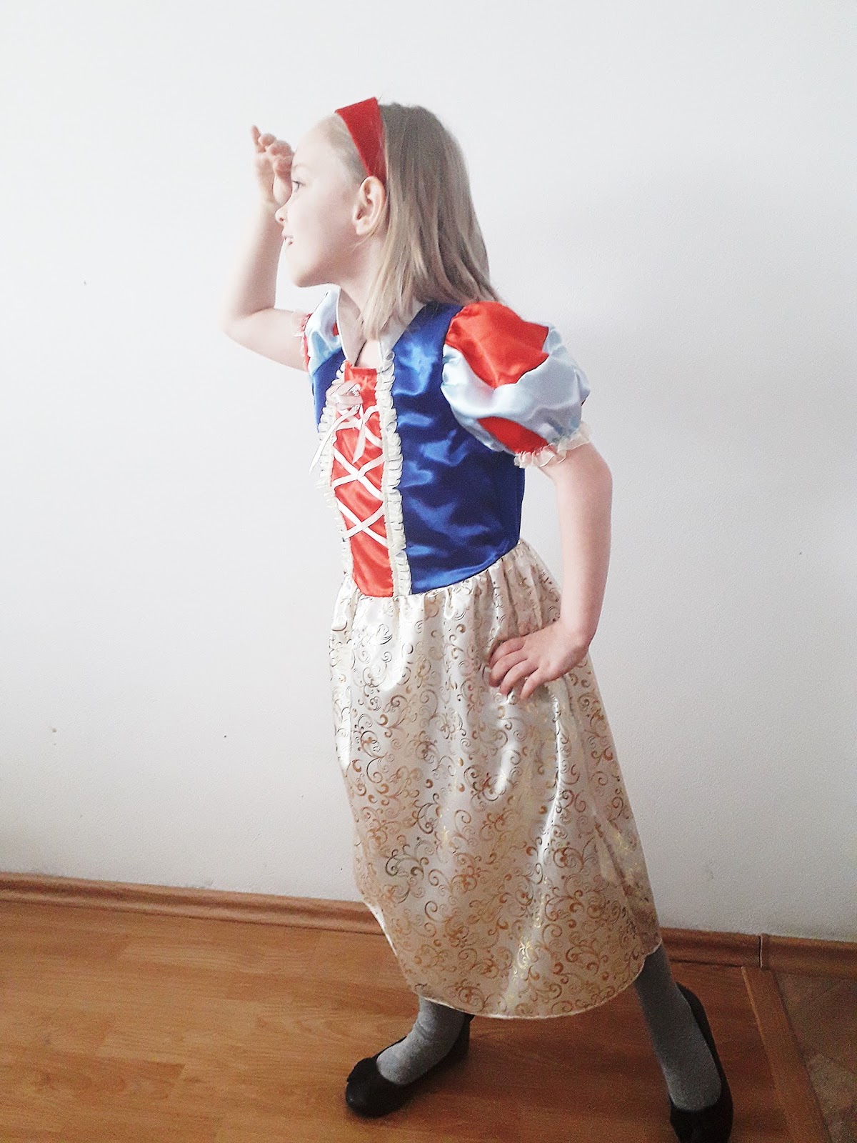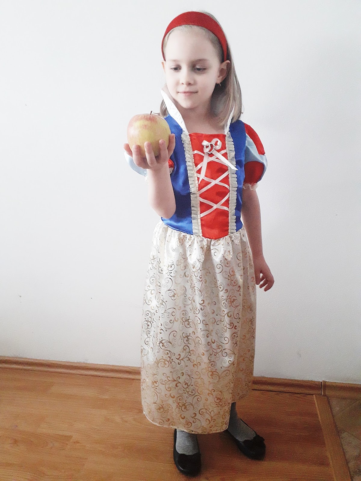 Śnieżka również jest jedną z uwielbianych przez dziewczynki postacią z bajek. Dlatego postanowiłam kupić cudowną sukienkę Śnieżki. Sukieneczka jest zwiewna, bardzo delikatna. Ma śliczne, bufiaste rękawy i kołnierz. Ozdobna złota wstążka dodaje sukience blasku. Kolory są idealni dopasowane. Wykonana została bardzo starannie, dzięki czemu będzie mogła służyć przez długi czas. Według mnie sukieneczka jest cudowna i jest doskonałym przebraniem. Nikomu nie trzeba mówić, że to Śnieżka, widać to gołym okiem 🙂