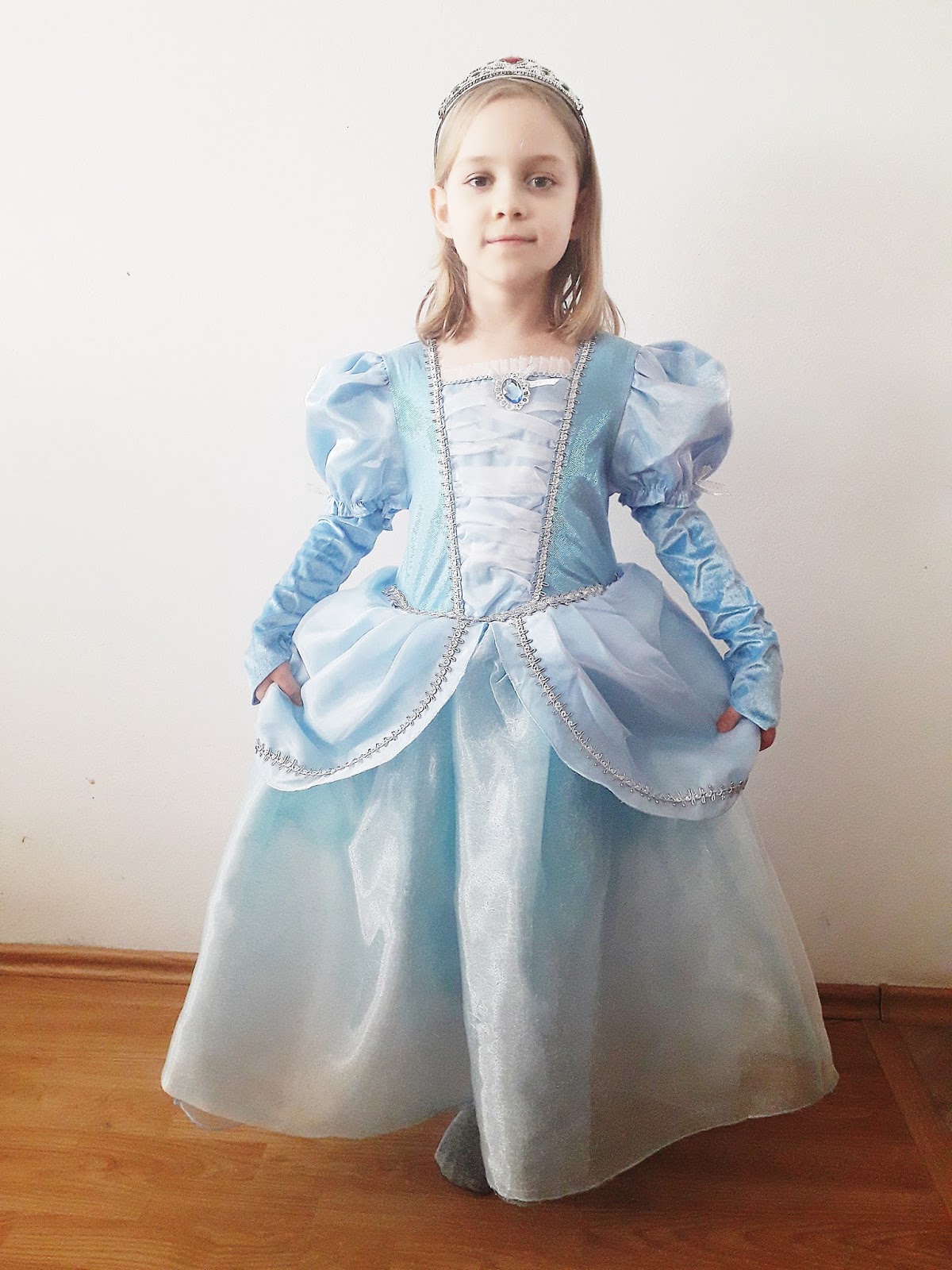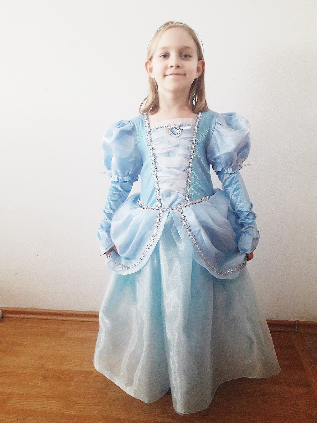 Na pewno wszyscy znamy Kopciuszka, prawda? Jest to piękna historia, znana od wielu pokoleń. Ja w dzieciństwie uwielbiałam Kopciuszka i nieraz czytałam książkę, oglądałam filmy i przebierałam się, jednak kiedyś nie było takich pięknych sukienek. Ponieważ Hania również bardzo lubi Kopciuszka, więc zamówiłam jej piękną, błękitną suknię.Dolna część, to spódniczka, składająca się z kilku warstw tiulu. Wierzchnia warstwa ozdobiona jest srebrną tasiemką. Góra również posiada tę tasiemkę. Gorset w środkowej części ma falbankę i dużą broszkę. Oczywiście, nie mogło zabraknąć pięknych, bufiastych rękawów i welurowych rękawiczek. Sukienka jest wykonana bardzo starannie, a bogactwo zdobień sprawia, że wygląda doskonale, tak jak Kopciuszek. Suknia jest bardzo stylowa i szykowna. Do tej pięknej sukienki wystarczy dodać szklane pantofelki i Kopciuszek jak malowany 🙂