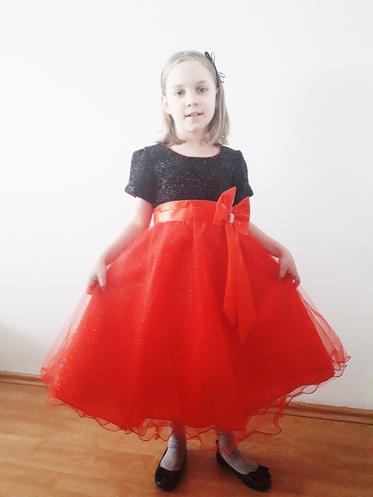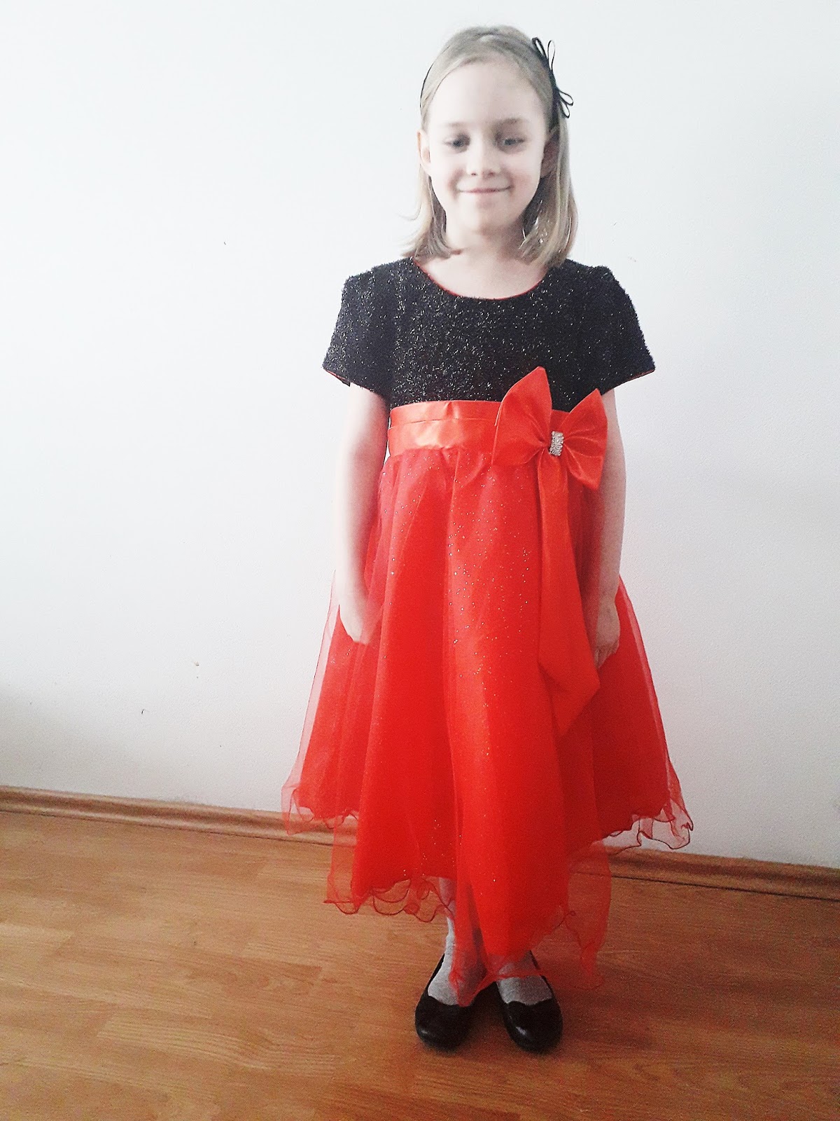 Znalazłam tam także piękną, wizytową sukienkę. U dołu ma kilka warstw tiulu, a u góry czarny, lekko włochaty, błyszczący materiał. Całość doskonale się komponuje. Kreacja ma z przodu i z tyłu kokardę/ Tę z tyłu można odpiąć lub spiąć sukienkę w pasie, jeżeli jest za szeroka. Dzięki temu może być zarówno dla mniejszych, jak i większych dzieci. Doskonale nadaje się na Sylwestra, czy na wesele, a także inne ważne imprezy okolicznościowe. Tiulowa spódniczka posypana jest brokatem, który bardzo dobre się trzyma i nie osypuje. Jeżeli idziecie do teatru, na wesele, czy na inną ważną imprezę, ta sukienka będzie doskonała. Hania jest nią zachwycona.