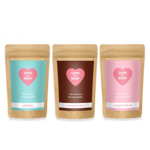 „Kochaj swoje ciało! Zwalczaj cellulit. Oczyszczaj, odżywiaj i regeneruj skórę. Naturalnie nawilżaj swoje ciało. Wybraliśmy najlepsze naturalne składniki specjalnie dla Ciebie. Bądź piękna z LOVE YOUR BODY. Sposób użycia: zwilż ciało wodą, nałóż peeling na skórę, masuj okrężnymi ruchami, pozostaw na ciele 5-10 minut, dokładnie spłucz. Naturalne składniki peelingu: ziarno kawy robusta, olej makadamia, olej arganowy, kakao, cukier, sól morska, witamina E. Bez SLS, parabenów, barwników, konserwantów”.