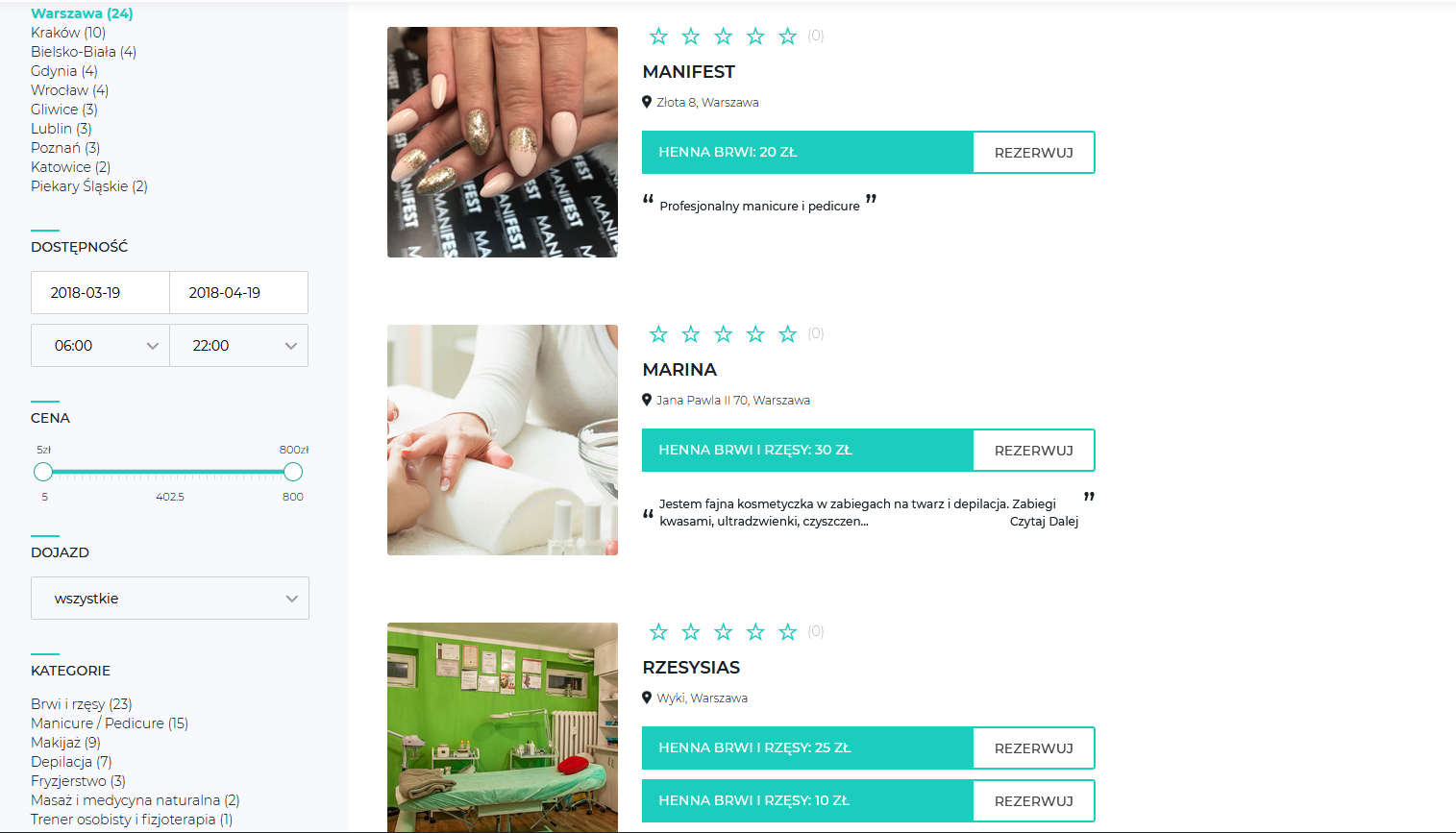 Rezerwacja wybranej usługi jest banalnie prosta. Wystarczy zarejestrować się na stronie, bez tego nie uda nam się nic zrobić. Następnie logujemy się na nowo powstałe konto i wyszukujemy dana usługę. Możemy to zrobić poprzez wybranie kategorii lub wpisanie danej frazy w lupkę. Według mnie poruszanie się po stronie jest bardzo intuicyjne i każdy sobie z tym poradzi. Wszystkie usługi zostały podzielone na kategorie: Fryzjerstwo, Brwi i Rzęsy, Manicure i Pedicure, Makijaż, a nawet Fotografia, czy Stylista. Można także użyć filtra, wybierając konkretną datę czy godzinę, zakres cenowy lub ocenę usługodawcy. Wybór jest bardzo duży i każdy może znaleźć to, czego poszukuje. Kiedy znaleźliśmy jż usługę która nas interesuje, wystarczy już tylko kliknąć „rezerwuj” i wybrać datę i godzinę, która będzie nam odpowiadać. Gdy zarezerwowaliśmy daną usługę, osoba, która wybraliśmy do zrealizowania zamówionej przez nas usług, otrzymuje nasze dane kontaktowe, aby doprecyzować usługę, dopytać o nasze preferencje, lub powiadomić nas na przykład o zmianie terminu. Po rezerwacji, na adres email, a także na SMS dostaje powiadomienie o rezerwacji usługi i kontakt do usługodawcy.