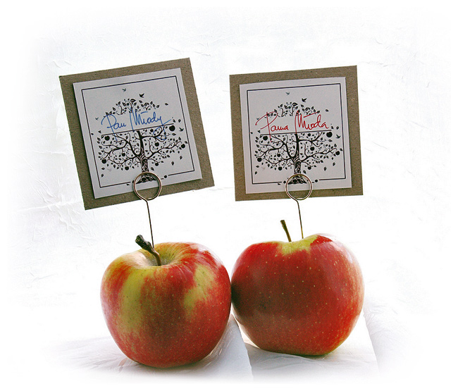 Organizując wesele, zastanawiamy się na początku jak odpowiednio rozsadzić gości. W tym celu stosowane są wizytówki. Warto do nich także wprowadzić owocowy element tworząc taką wizytówkę na podstawie jabłka. Ciekawy, owocowy i smaczny pomysł. Jeżeli oczekiwanie na posiłek będzie zbyt długie, zawsze można chrupnąć kawałek takiego jabłka 😛