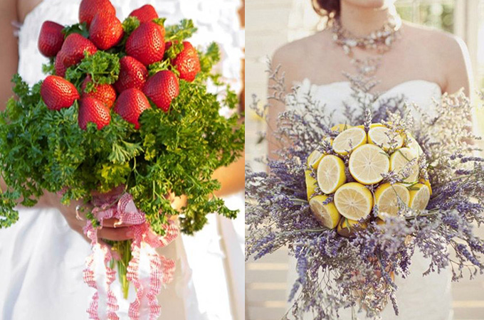 Nie spotkałam się wcześniej z takim owocowym weselem i o ile pomysł z zaproszeniami w owoce mi się podoba to bukiet już nie