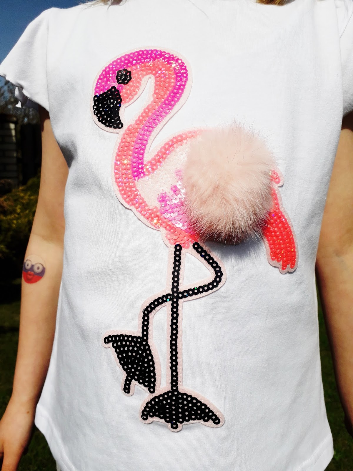 Świetna jest ta bluzeczka z flamingiem, pomponik super wyglada