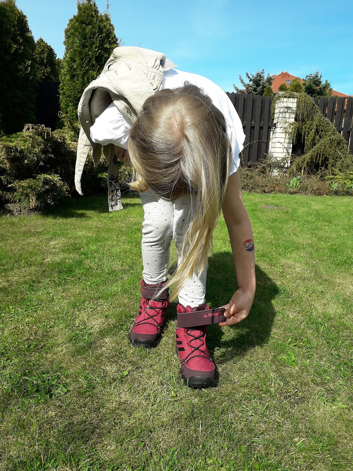 Na wycieczki, szczególnie po wyższych górach niezbędne są wygodne buty, dlatego wybraliśmy lekkie traperki od Adidas. Buty mają piękny, dziewczęcy, czarno-różowy kolor. Zapinane są na wyjątkowo trwały rzep. Zostały wyposażone także w specjalne gumki, aby but dobrze przylegał do stopy dziecka. Buty są bardzo trwałe i nieprzemakalne. Idealne na wakacyjne wyprawy i odkrywanie tajemniczych miejsc. Dzięki temu, że są wysokie, sięgają za kostkę, chronią przed ukąszeniami owadów. Zabawa w deszczowych kałużach także nie jest im straszna. Dzięki specjalnej podeszwie nie zapadają się, więc chodzenie po nietypowym podłożu nie jest problematyczne. Są idealne dla tak aktywnych dzieci, jak Hania.