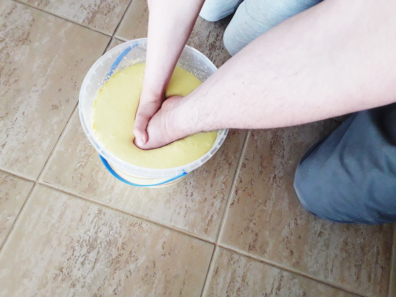 6. Gdy mamy gotową formę zabieramy się za przygotowywanie gipsu. Do drugiego wiaderka wlewamy wodę, rozrabiamy gips i wlewamy go do przygotowanej formy.