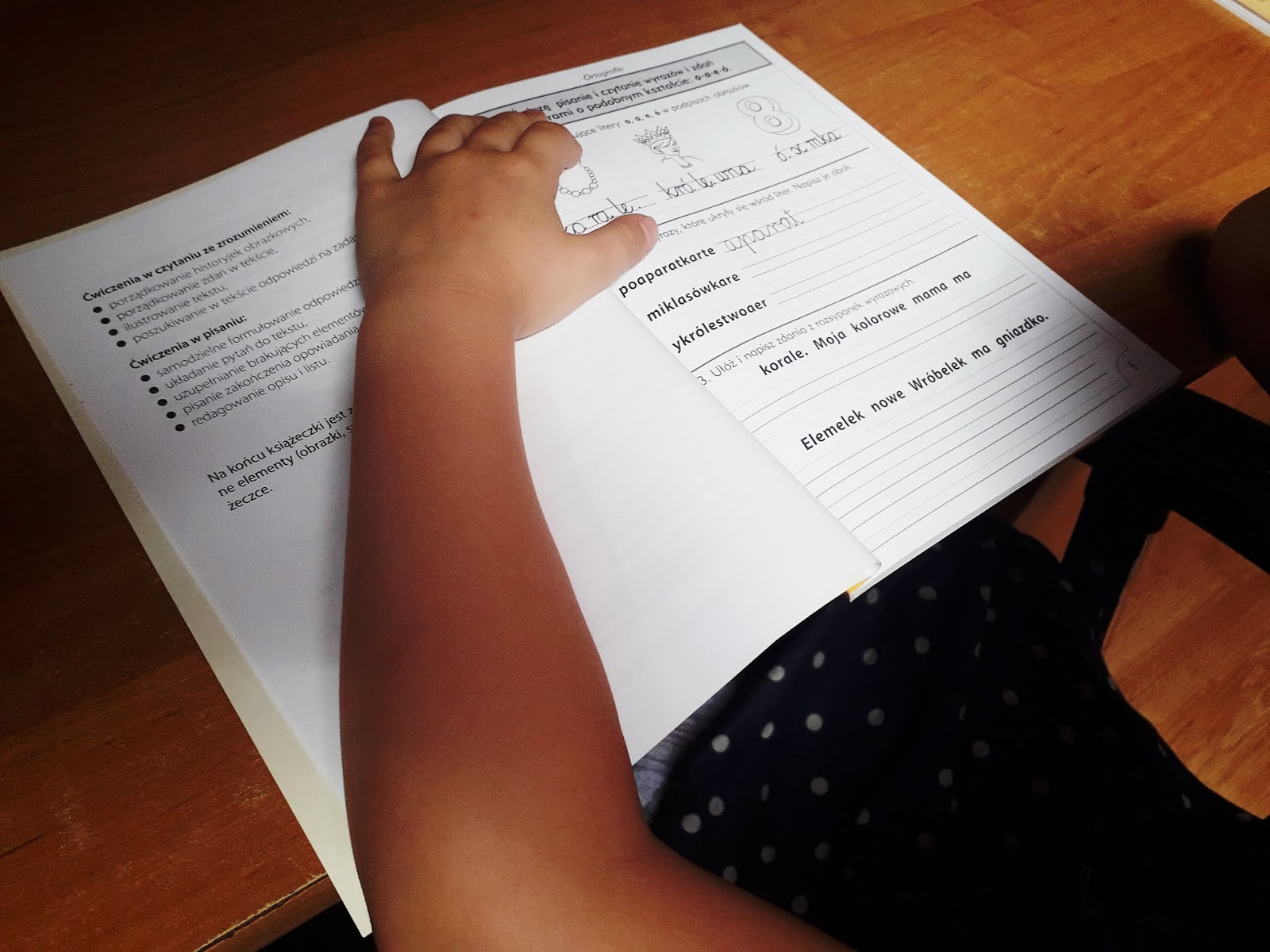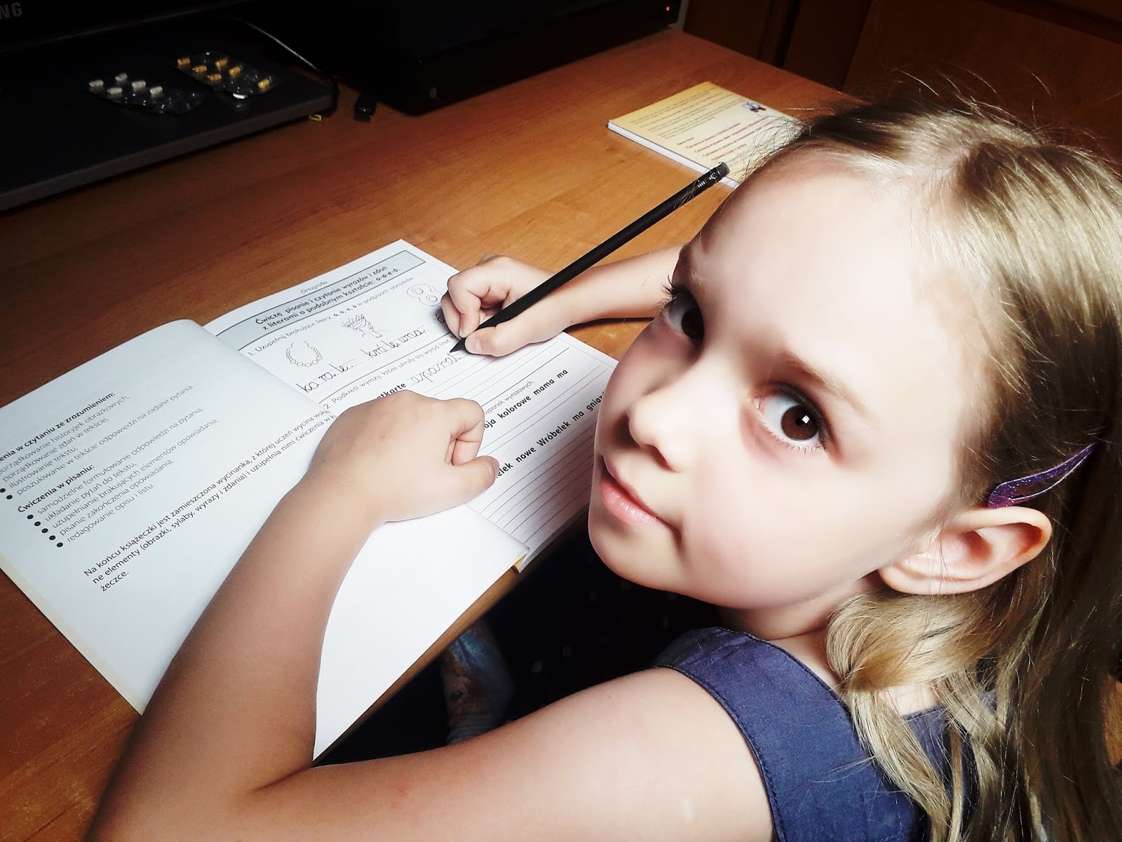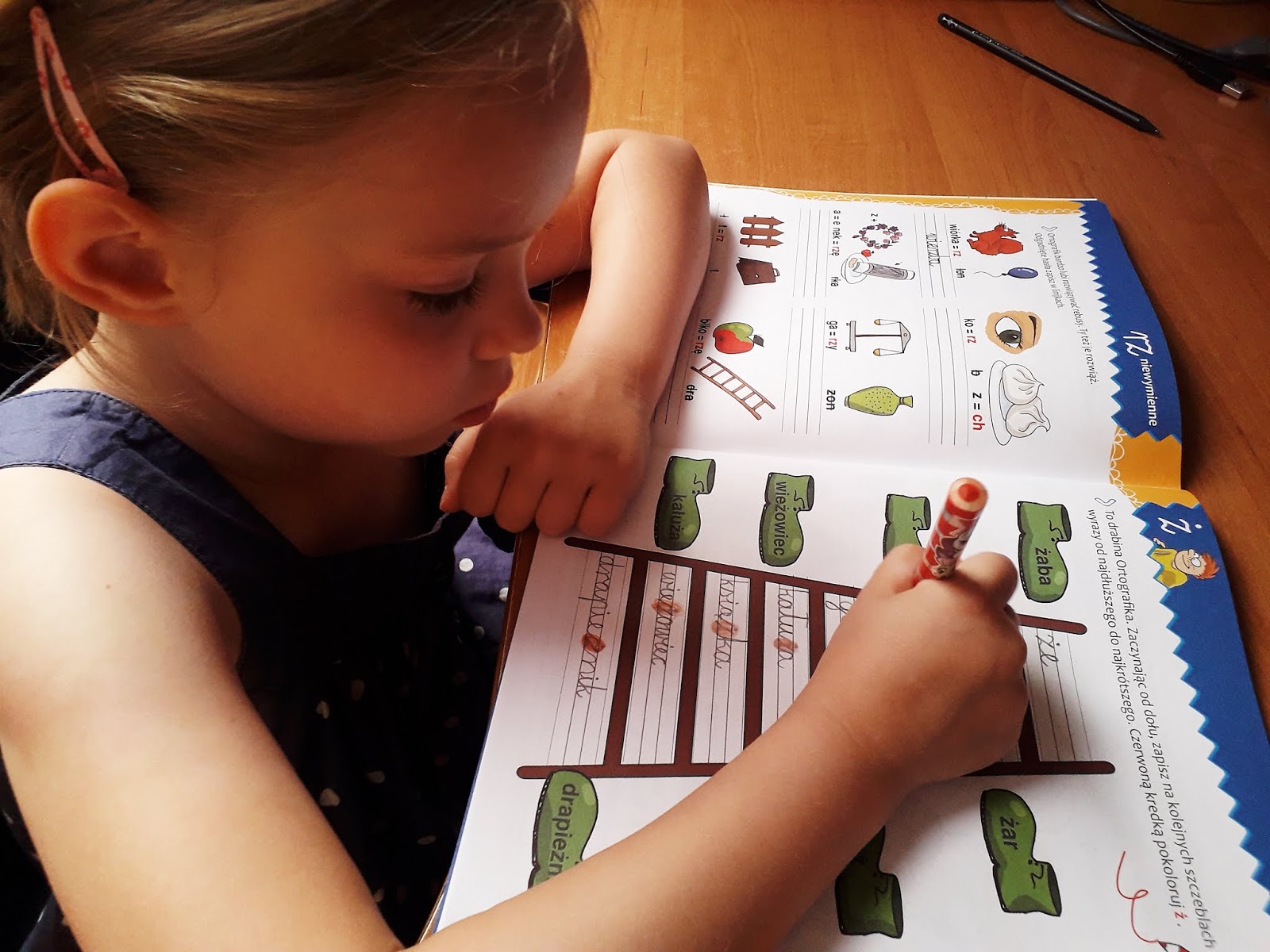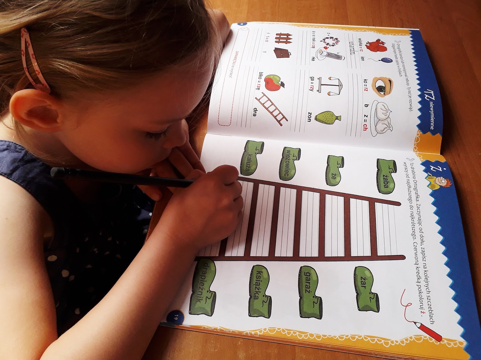 Książeczka w ciekawy sposób rozwija różne umiejętności. Została podzielona na kilka działów, takich jak szkoła, dom i rodzina i zabawa. Na końcu znajdują się wycinanki, z których można układać zdania. Zadania są bardzo różnorodne, dzięki czemu dziecko dużo chętniej je rozwiązuje. Ja już zauważyłam poprawę w zdaniach pisanych przez Hanię. Oby tak dalej.