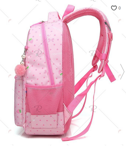 Znalazłam też inny, różowy plecak Ruipai S1967 Cartoon Waterproof Printing Children’s Backpack Shoulder Bag –Flaming Pink – Small w małe, białe kropeczki. Można na nim znaleźć także drobne, ozdobne kwiatki i kokardki. Na środku widnieje znaczek z postacią baletnicy. Doczepiono do niego też cudny, puchaty breloczek. Zamek został dodatkowo udekorowany. Plecak emanuje „słodkością”. Jest usztywniany, bezpieczny dla pleców dziecka. Również posiada drobną siateczkę, gdzie można włożyć butelkę wody. Można go nieść na plecach lub w ręce, trzymając za wzmocniony uchwyt. Plecaczek posiada dwie pojemne kieszenie. W dużą można włożyć podręczniki, a w małą drugie śniadanie. Jest nieco mniejszy niż ten, który pokazywałam na początku. Myślę, że jest to ciekawa propozycja, choć proponowałabym go raczej do przedszkola i do zerówki. Później może okazać się za mały.
