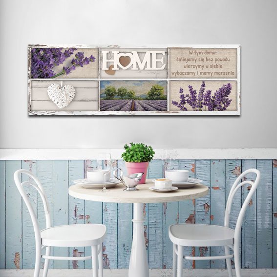 Pragnęłam dodać do kuchni jakiś drobny element, który sprawiłby, że byłoby w niej równie kolorowo, co wiosną. Pomyślałam, że idealnie nada się do tego blacha, na której uwiecznione będą kwiaty. Szukałam czegoś stylowego, ale jednocześnie uniwersalnego i zdecydowałam się na obraz z susząca się lawendą. W tle można zauważyć deski z jasnego drewna. Całość została ozdobiona na brzegach nieregularnym, ciemnobrązowym wzorem. Wygląda bardzo oryginalnie.