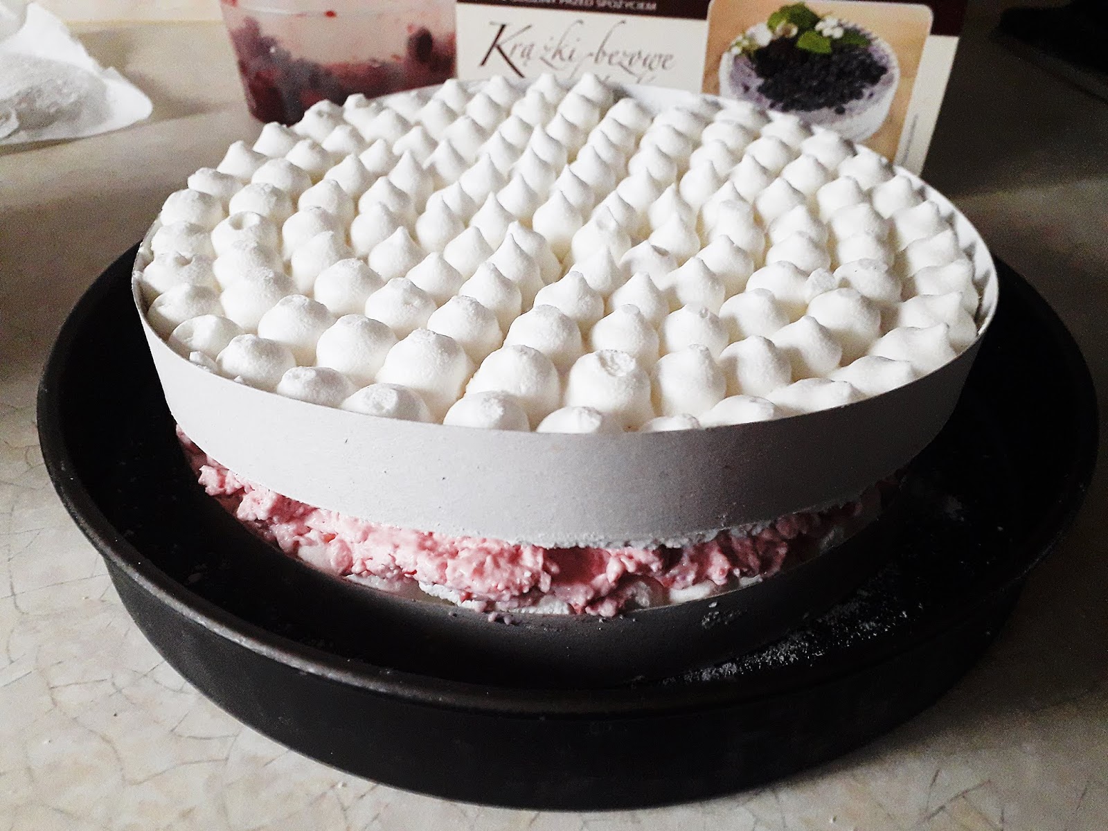 Na jeden spód bezowy nakładamy opaskę do tortów (można włożyć do tortownicy), wkładamy połowę masy, posypujemy połową z 1/3 odłożonych owoców.