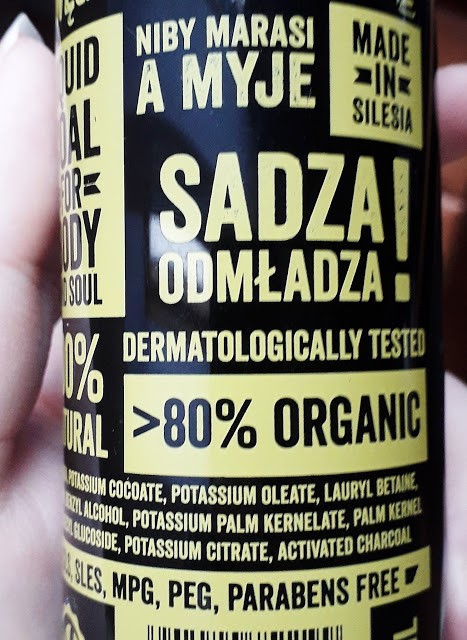 Mydło w płynie znajduje się w smukłej, plastikowej buteleczce, która została wyposażona w zamknięcie na „klik”. Jest bardzo poręczna i elastyczna, a dzięki pojemności aż 250ml będzie towarzyszyła przy niejednej codziennej pielęgnacji. Jej szata graficzna jest bardzo charakterystyczna właśnie dla tej marki. Osobiście postawiłam na nieco inne połączenie, bo czerń raczej odstrasza. Mimo to, połączenie czarni i żółci daje nietuzinkowy i bardzo oryginalny wygląd. Takie połączenie sprawia, że stosowanie produktu jest łatwe, a wygląd zewnętrzny przyjemny dla oka. Na opakowaniu widnieją teksty w 3 językach: po polsku, po śląsku i po angielsku.
