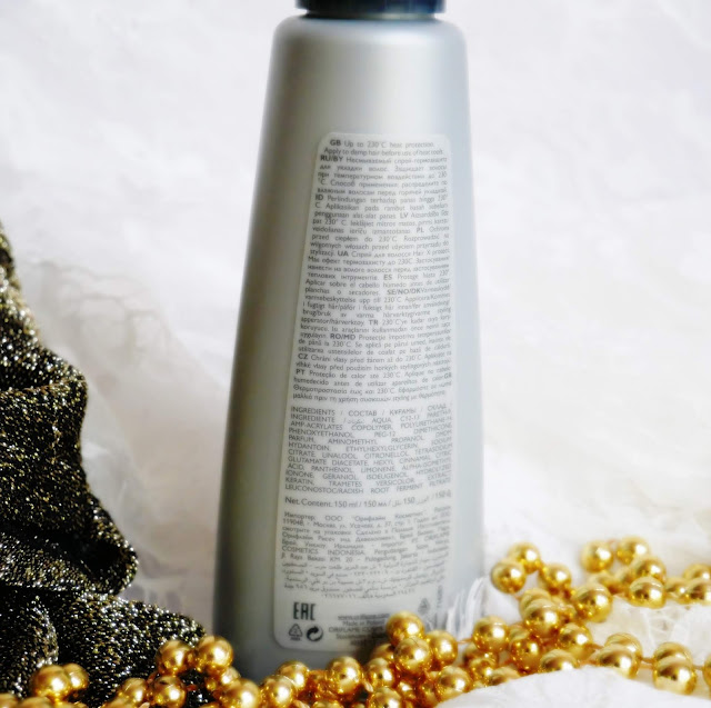 Spray został tak skomponowany, aby każdy jego składnik dodatkowo chronił włosy. Preparat zawiera keratynę i inne Zawiera aktywne substancje ochronne, które skutecznie chronią przed niszczącym wpływem wysokich temperatur aż do 230°C