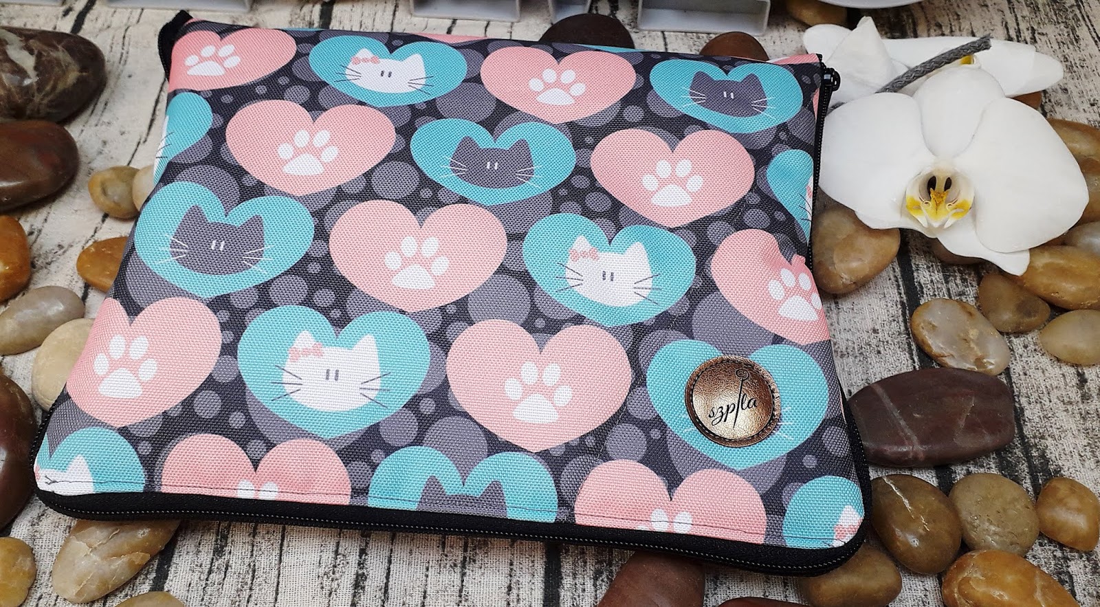 Etui prezentuje się rewelacyjnie! Na zewnątrz n szarym tle serduszka w kolorze morskim i różowym, a na nich łapki i kocie główki, wygląda przeuroczo. Do tego jeszcze czarny zamek dopełnia całość. W środku natomiast na białym tle również znajdują się podobizny kotów w różnych kolorach, do których idealnie dopasowane są gumki znajdujące się w środku. Oczywiście do wyboru jest wile różnych wzorów i kolorów, dzięki czemu każde zamówione etui może być inne.