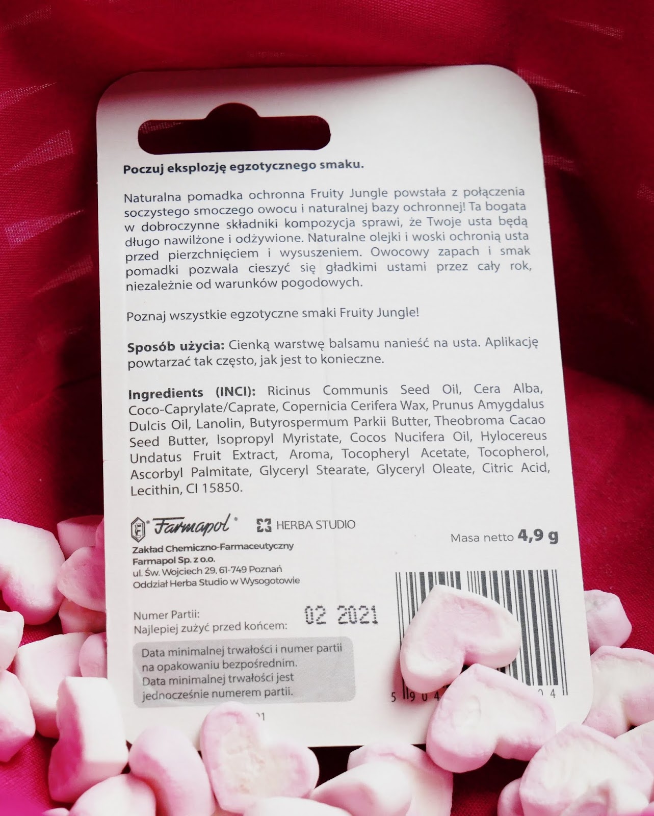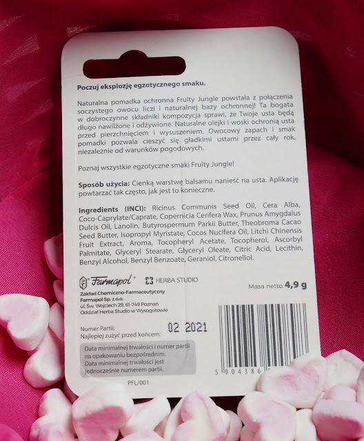 pomadka Fruity jungle liczi: ekstrakt z owocu liczi, wosk pszczeli, wosk carnauba, olejek ze słodkich migdałów, masło shea, masło kakaowe, olej kokosowy, olej rycynowy, lanolina, witamina E.