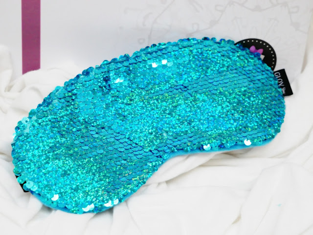 Nie można oczywiście zapomnieć o maseczce która jest totalnym hitem tego pudełka. Nigdy wcześniej nie używałam takiej maski, dlatego była to dla mnie kolejna nowość. Dzięki uniwersalnym rozmiarom i elastycznej gumce maska doskonale się dopasowuje i zasłania światło, gwarantując nam w ten sposób spokojny i błogi sen. Ja dzięki niej spałam tak dobrze, jak nigdy dotąd. Naprawdę maska czyni cuda. Od spodu jest miękki materiał, dzięki któremu nie podrażnia skóry. Do tego te cudowne, miękkie cekiny sprawiają, że aż nie da się oderwać od niej wzroku.