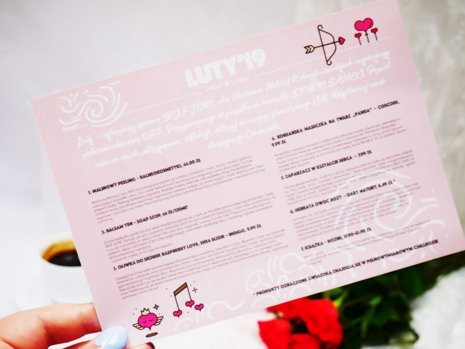 Luty jest niezwykłym miesiącem. W końcu to czas Walentynek, kiedy dwie osoby pragną pokazać swoje uczucie i sprawić drugiej połówce radość. Dlatego zespół ChillBox również chciał ofiarować swoim subskrybentom jak najwięcej ciepła i miłości. Hasłem, jakie przyświeca tej edycji jest malinowa miłość. Wszystkie elementy tego pudełka pozwalają na chwilę przyjemności, bo w końcu najważniejsze, to kochać innych, ale również samego siebie.