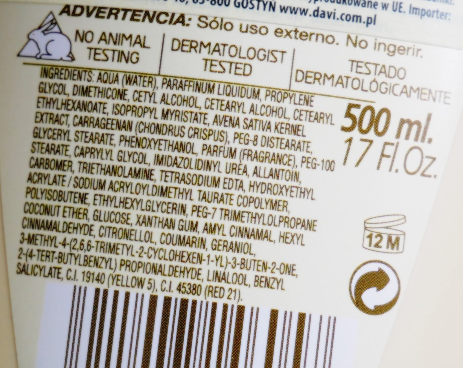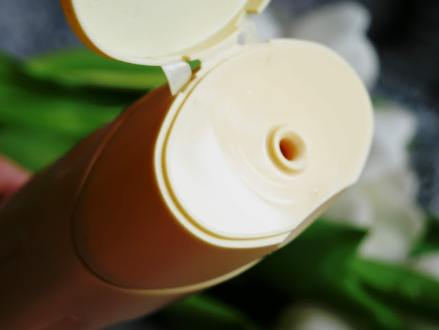 Mleczko do ciała znajduje się w dużej, plastikowej buteleczce o pojemności 500 ml. Wykorzystano w niej zamknięcie na klik, które ułatwia aplikację kosmetyku bezpośrednio na dłoń. Opakowanie jest stabilne więc można postawić je na łazienkowej półce i korzystać z niego zaraz po kąpieli. Sam jego wygląd i szata graficzna jest czytelna i miła dla oka. Ukłon ze strony producenta za naklejkę z opisem w języku polskim. Znajdziemy tam wszystkie niezbędne informacje. Niestety buteleczka jest dosyć ciężka i mało poręczna. Ślizga się w dłoniach, a jej kształt i dwa wyżłobienia z tyłu wcale tego nie ułatwiają. Do tego nie można kontrolować zużycia produktu. Myślę, że lepiej sprawdziłoby się, jakby było o połowę mniejsze. Koniec końców pewnie przełożę kosmetyk do jakiegoś słoiczka i będę powoli zużywać.