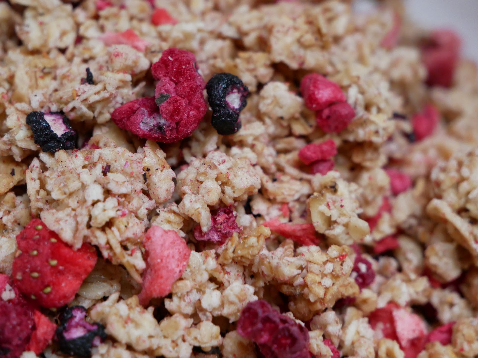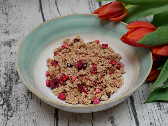 Na początku myślałam, że jest to coś całkowici odrębnego, dopiero po uchyleniu denka zobaczyłam, że są to po prostu crunchy z czerwonymi owocami. W środku dużo przepysznych, kruchych płatków, a pomiędzy nimi owoce liofilizowane (truskawka, malina) oraz borówka kandyzowana. Całość doskonale smakuje, a w połączniu z mlekiem, czy jogurtem tworzy idealny, smaczny i pożywny posiłek. Taki kubek z chrupiącą zawartością można wziąć do pracy i zjeść w wolnej chwili. Crunchy zawierają dużo błonnika, więc dodatkowo wpływają pozytywnie na pracę układu pokarmowego. Ja zjadłam je na drugie śniadanie i porcja była w sam raz na takie małe co nieco. Od razu przypomniały mi się letnie dni, kiedy jadłam maliny u dziadka prosto z krzaczka…Pycha!