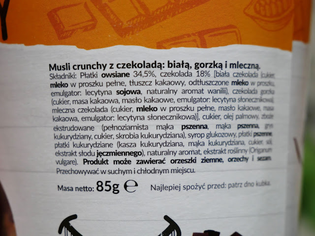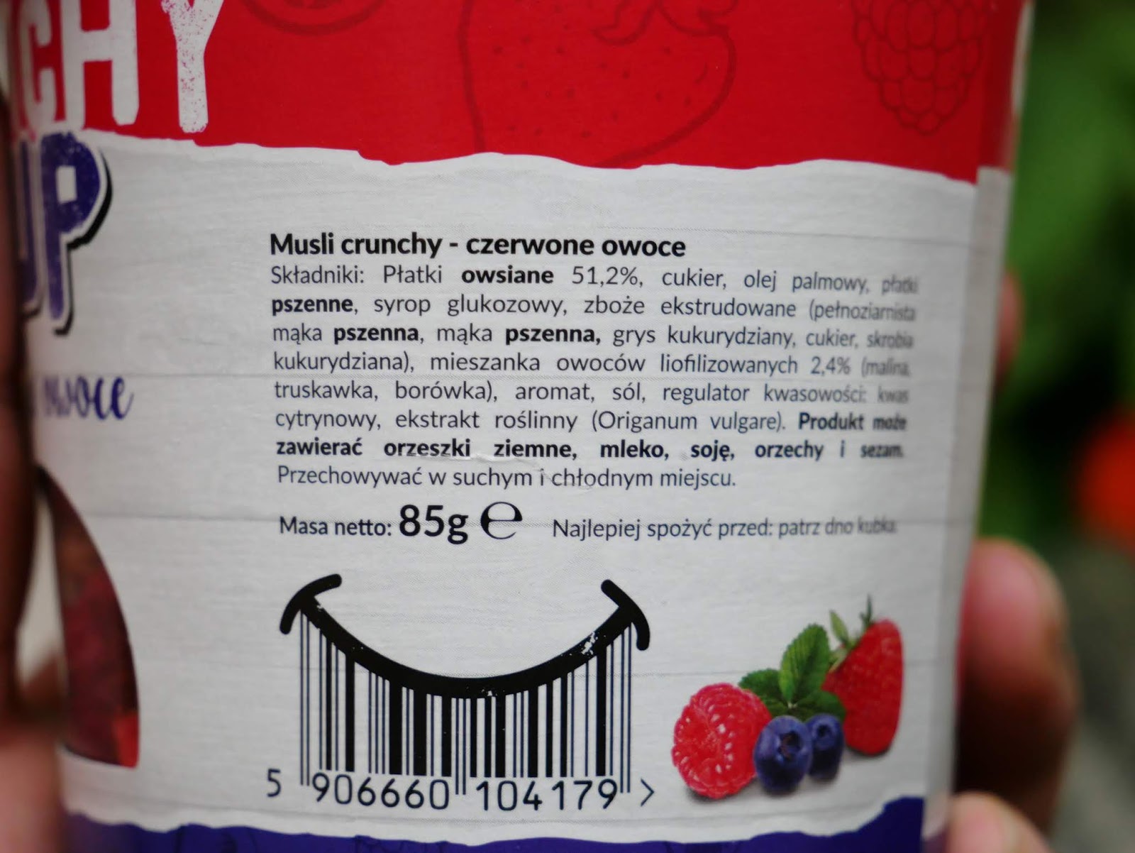 Crunchy dostępne są w opakowaniu typu kubek z okienkiem – do spożycia bezpośrednio po otwarciu. Można wrzucić taki kubeczek do plecaka i zjeść w wolnej chwili z mlekiem, jogurtem, czy na sucho. Myślę, ze to wygodne rozwiązanie, szczególnie kiedy budzik nie zadzwoni, czy po prostu się zaśpi. To idealna przekąska do zjedzenia w domu, w pracy, czy na przystanku podczas podróży. Opakowanie jest bardzo wygodne i poręczne. Według mnie to najlepsze rozwiązanie, jakie można było w tym przypadku wykorzystać. Na opakowaniu widnieją wszystkie istotne wiadomości, między innymi skład i wartość odżywcze. Dzięki małemu okienku możemy zajrzeć, co kryje zawartość poszczególnych kubeczków.