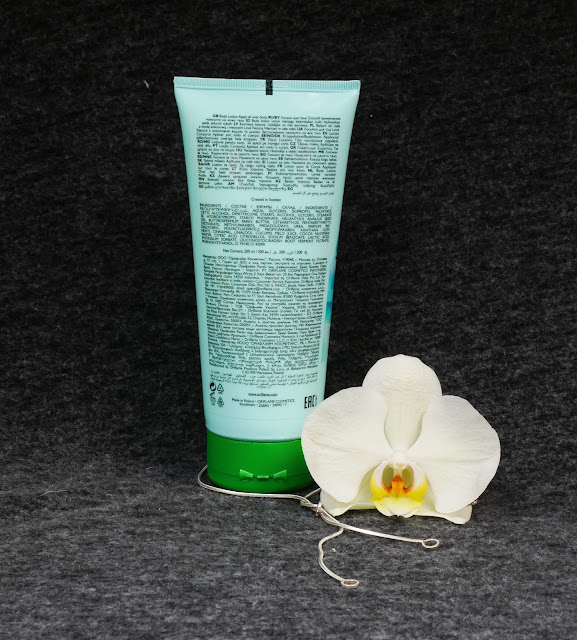 Balsam znajduje się w dużej, elastycznej tubie o pojemności 200 ml. Posiada zamknięcie na „klik”, dzięki czemu aplikacja kosmetyku jest bardzo wygodna. Na opakowaniu znajdują się najważniejsze informacje. Szata graficzna jest przejrzysta i czytelna. Połączenie błękitnego i zielonego koloru z innymi wakacyjnymi barwami wygląda doskonale. Całość utrzymana jest w iście wakacyjnym klimacie.