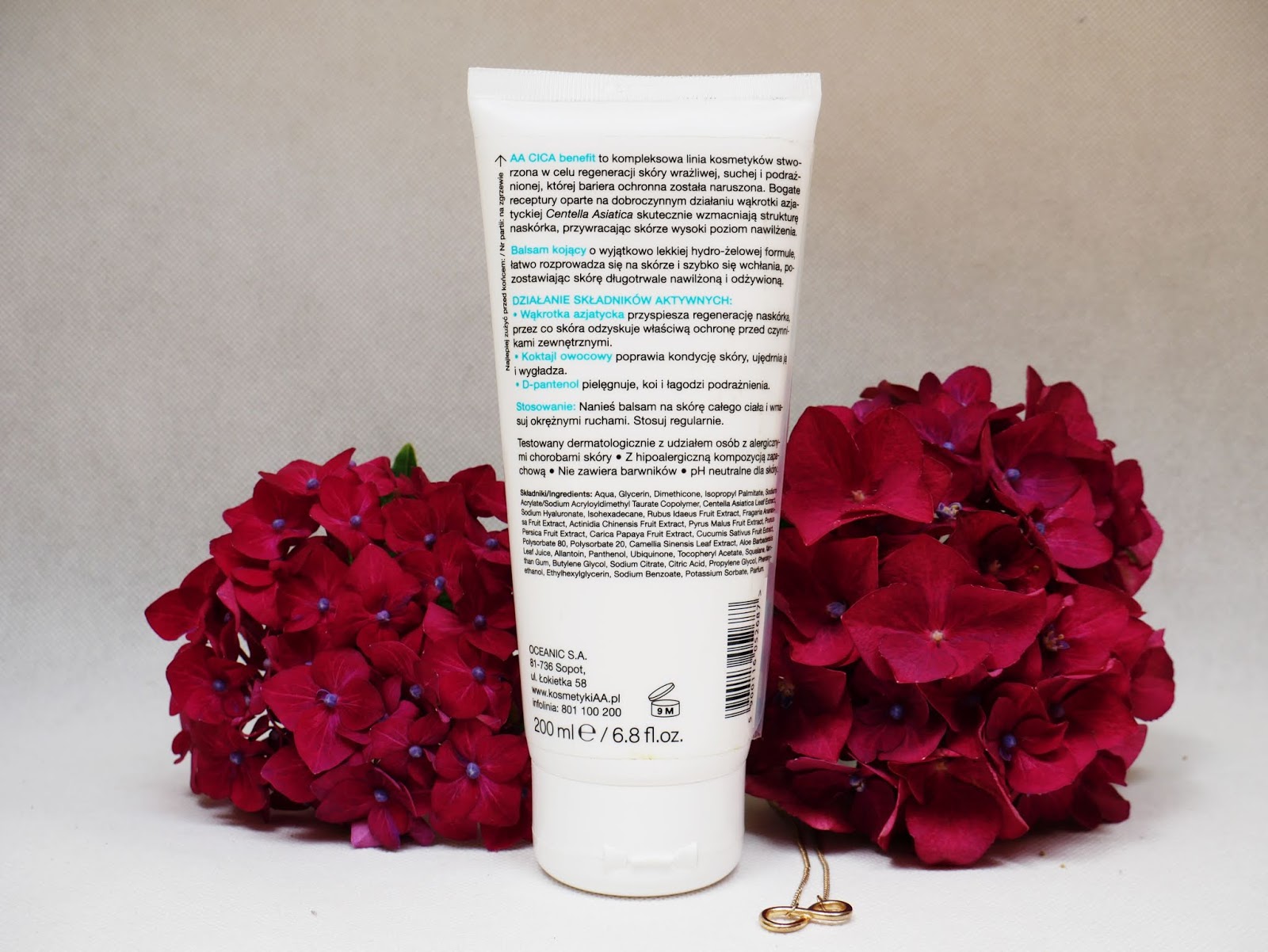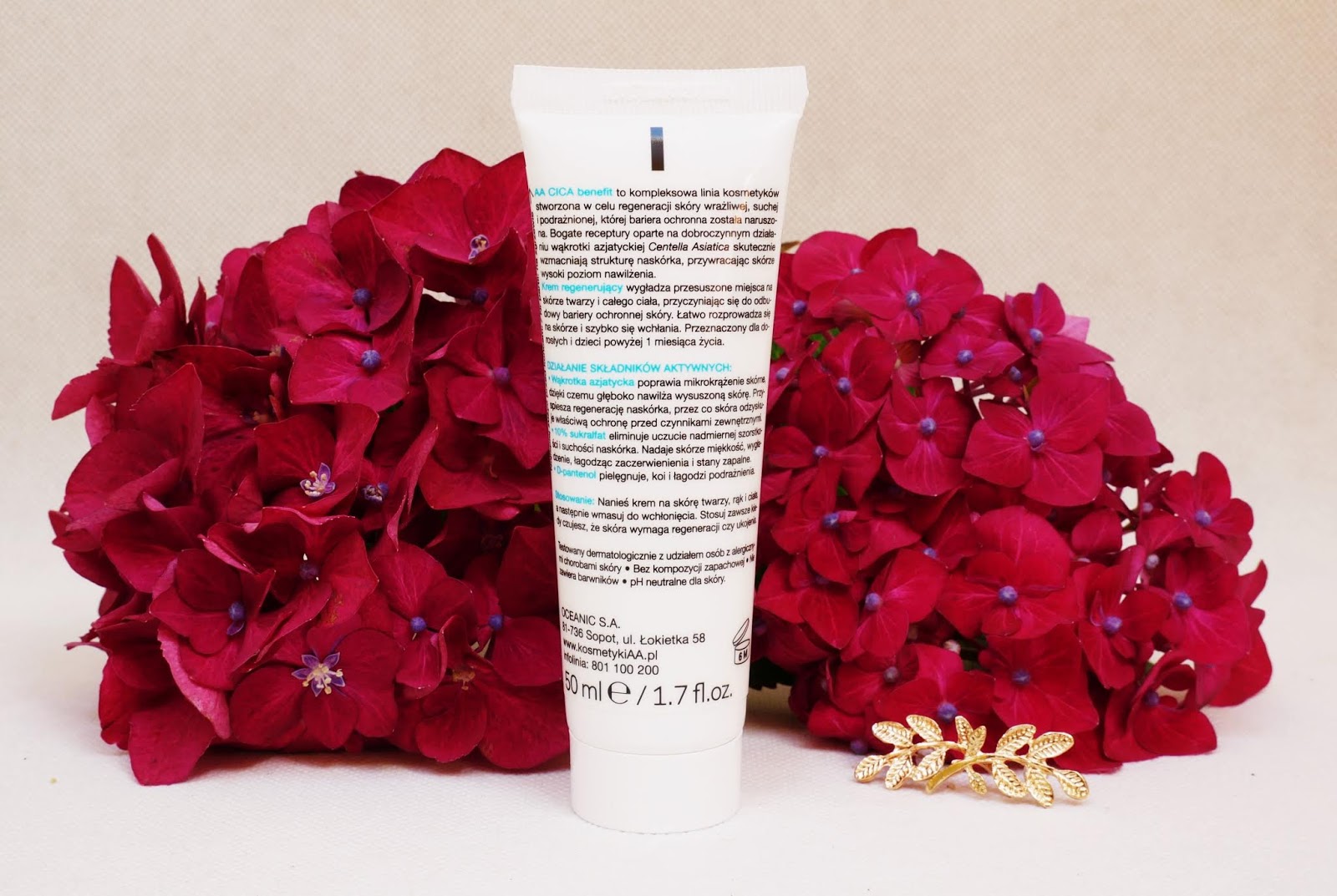 Skora twarzy jest bardzo delikatna i wymaga szczególnej uwagi. Wystarczy kilka dni przerwy, a stan cery od razu ulega pogorszeniu. Wybierając kosmetyki do pielęgnacji twarzy zwracam uwagę na działanie, skład i jego właściwości. Drugim kosmetykiem z linii AA Cica Benefit, który zwrócił moją uwagę, jest krem regenerująco-łagodzący. Krem ma lekką, kremową formuł o mleczno-białej barwie. Pod wpływem dotyku kosmetyk staje się bezbarwny. Nie pozostawia tłustej ani lepkiej warstwy, ale wyczuwalny jest delikatny fil, który chroni skórę przed negatywnym wpływem czynników zewnętrznych. Subtelny aromat towarzyszy przy każdej aplikacji, ale szybko znika. Kosmetyk polecany jest do stosowania przez dorosłych i dzieci już od pierwszego miesiąca życia. Nakładając odrobinę kremu na dłonie, odnoszę wrażenie, że jest to kosmetyk mocno odżywczy. Daje skórze dłoni wszystko, co najlepsze.