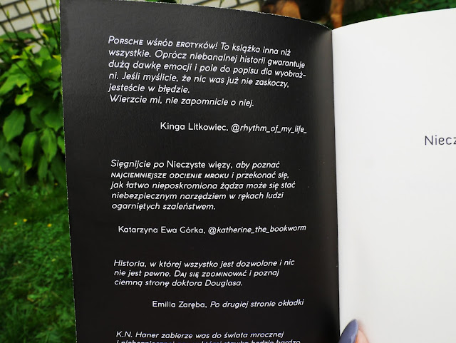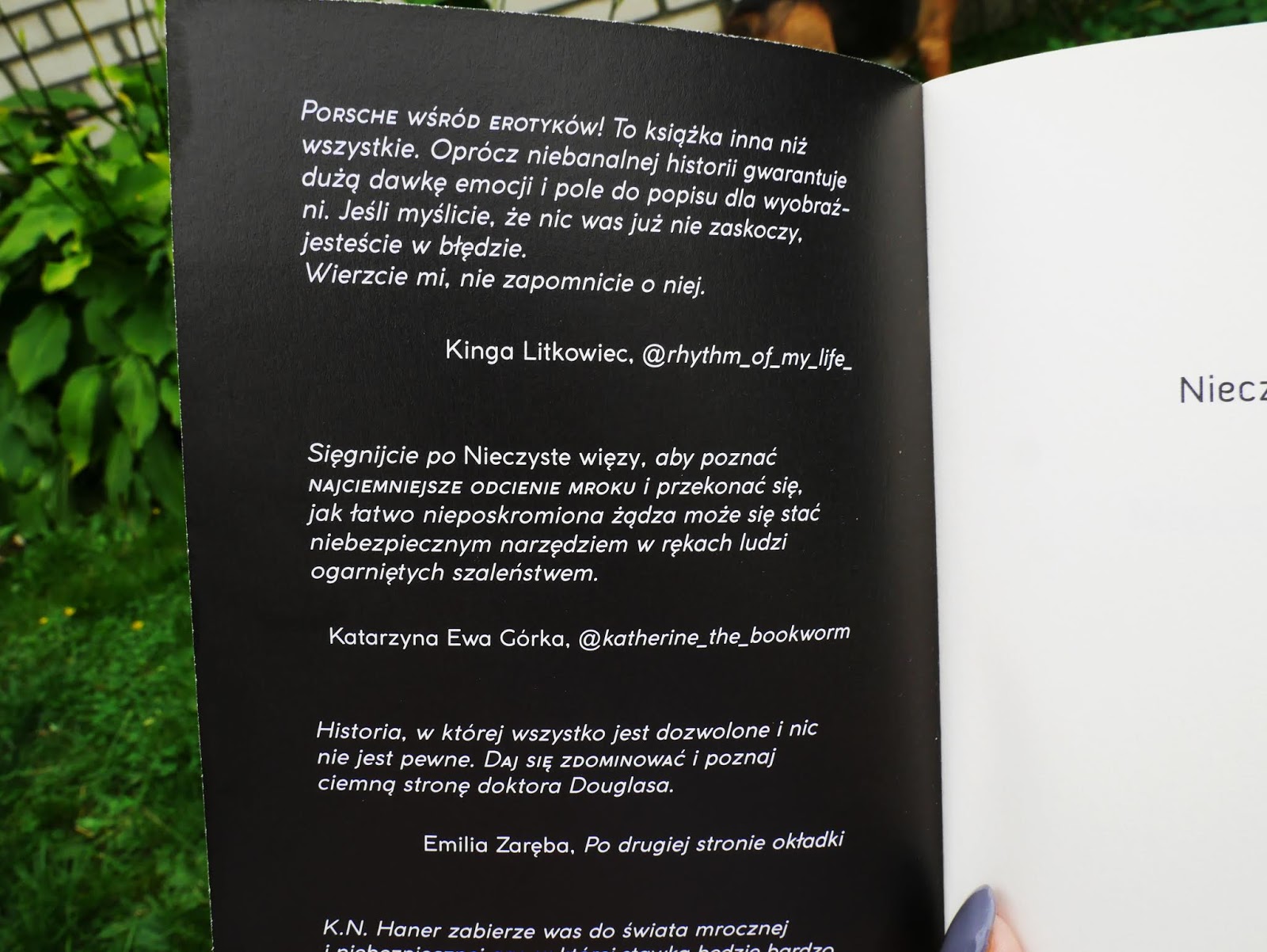 Książka napisana jest z perspektywy głównej bohaterki, co pozwala nam zajrzeć w głąb jej duszy. Czasami trudno zaakceptować jej decyzję, ale czasami stan emocjonalny wiele może nam tłumaczyć. Książka K.N. Haner zrobiła na mnie ogromne wrażenie, gdyż była to moja pierwsza książka przeczytana z tego gatunku. Czytałam ją z zapartym tchem i wypiekami na twarzy. Nie ukrywam, że koniec mnie zaskoczył i przeraził. Autorka trzyma czytelnika w napięciu do ostatnich stron. Polecam tę książkę, chociaż jest ona z pewnością nie dla każdego. Mnie bardzo zaskoczyła, bo przeczytałam kilka książek tej autorki i ta jest wyjątkowa. Inna niż pozostałe. Ciekawa jestem wszystkich opinii. Jeszcze raz polecam Wam książkę K.N. Haner „Nieczyste więzy”. Petarda!