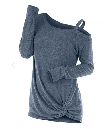 Ostatnią propozycją jest cienki szary sweter, wyglądem przypominający golf. Posiada długie rękawy. Delikatnie podkreśla biust i biodra. Na dole znajduje się ozdobne marszczenie, dzięki czemu wygląda bardzo oryginalnie. Oparty jest na jednym ramieniu. Posiada niewielki dekolt. Od razu wpadł mi oko. Doskonale będzie pasować do legginsów.