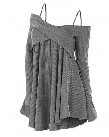 Pierwszą propozycją jest dosyć nietypowy sweter na cienkich ramiączkach. Posiada długie, proste rękawy. W biuście skrzyżowano materiał, dzięki czemu całość wygląda bardzo oryginalnie. To doskonały krój dla osób, które chcą ukryć swój biust, ale wyeksponować dekolt i ramiona. Do takiego swetra pasować będą legginsy lub jeansy. Jestem przekonana, że można stworzyć z nim wiele dziennych stylizacji.