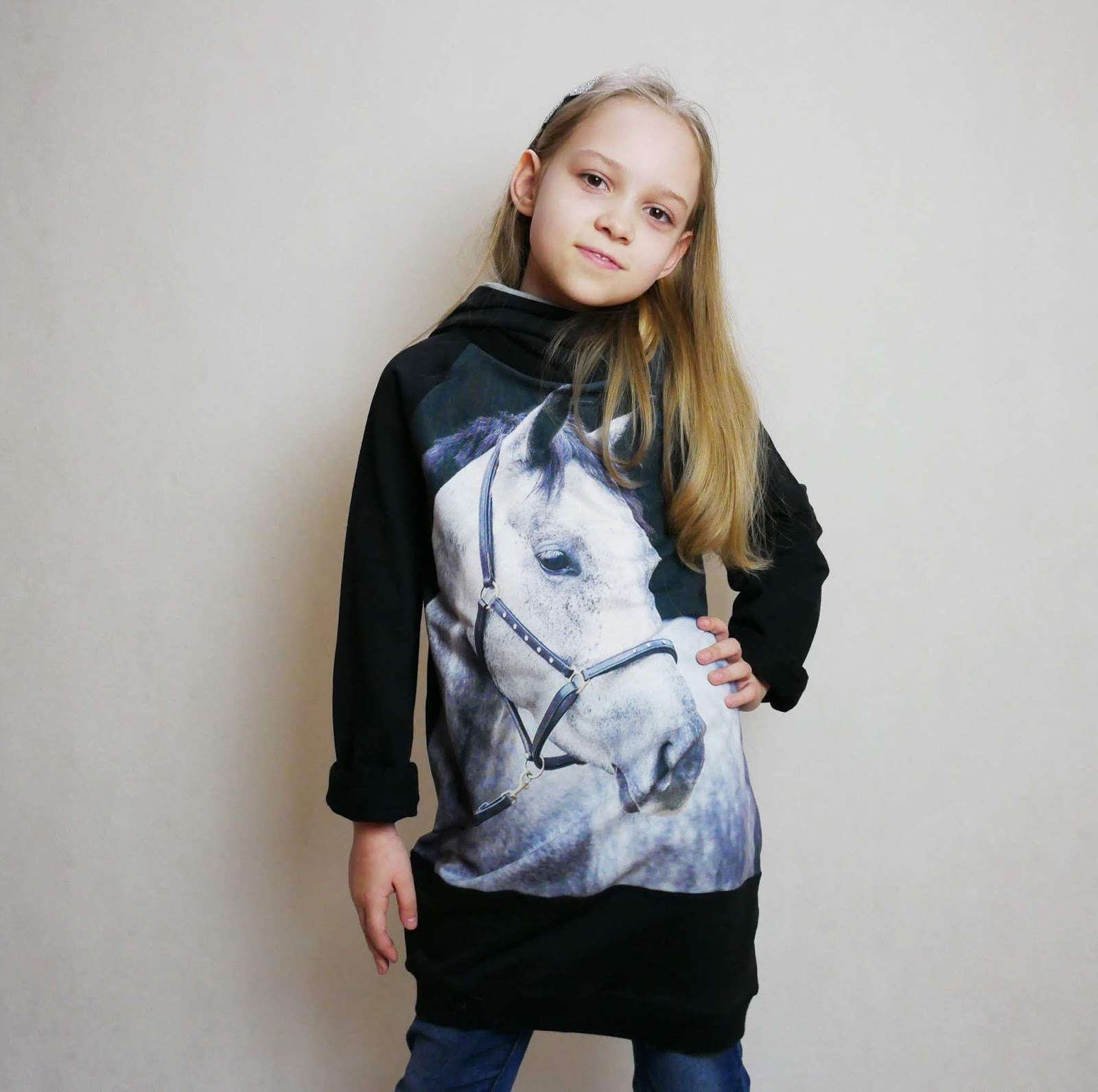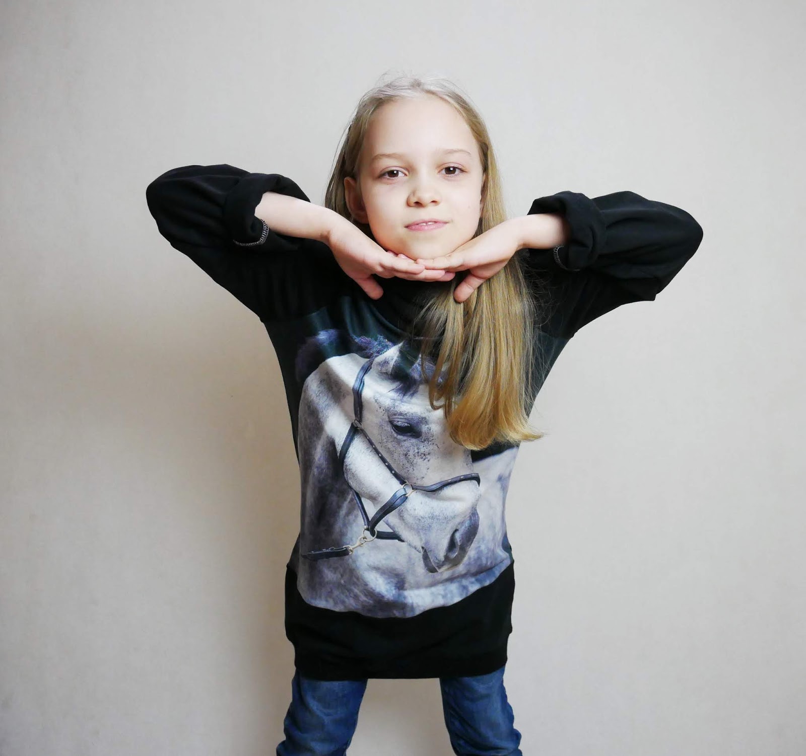 Bluza wykonana jest z wysokiej jakości materiału. Jest miękka i miła w dotyku. Aż nie chce się jej zdejmować. Nie miałam najmniejszych wątpliwości, że będzie to ulubiona bluza Hani. Składając zamówienie, możemy zdecydować, jak w efekcie końcowym będzie wyglądać bluza. My wybraliśmy ciemny, granatowy kolor oraz przepiękny nadruk z koniem. Hania je po prostu uwielbia, więc możecie tylko sobie wyobrazić, jaka była jej radość na widok tej bluzy. Po prostu oniemiała z zachwytu! Nie tylko świetnie wygląda, ale przede wszystkim jest ciepła i wygoda. Dodatkowo posiada kaptur i ściągacze, więc jest idealna, także na te chłodniejsze dni. Nadruk został doskonale wykonany, podobnie jak cała bluza. Nawet po kilku praniach nie blaknie i nie spiera się. Jest po prostu idealna dla tak wymagających dziewczynek, jak Hania!