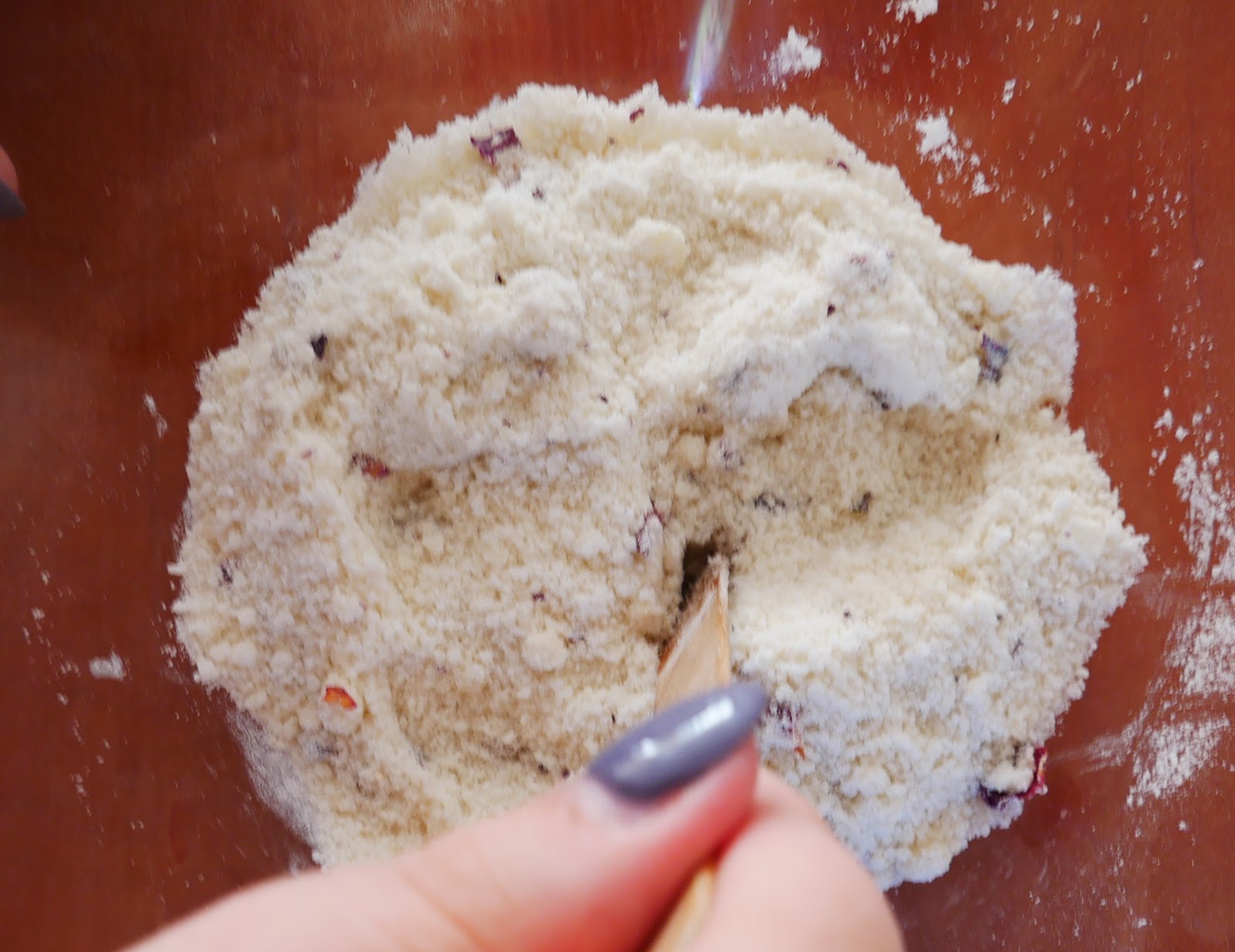 4. Następnie wlewamy olej z avocado oraz olejek eteryczny i całość ponownie mieszamy, delikatnie ugniatając masę. Już teraz można poczuć przepiękny, różany zapach.