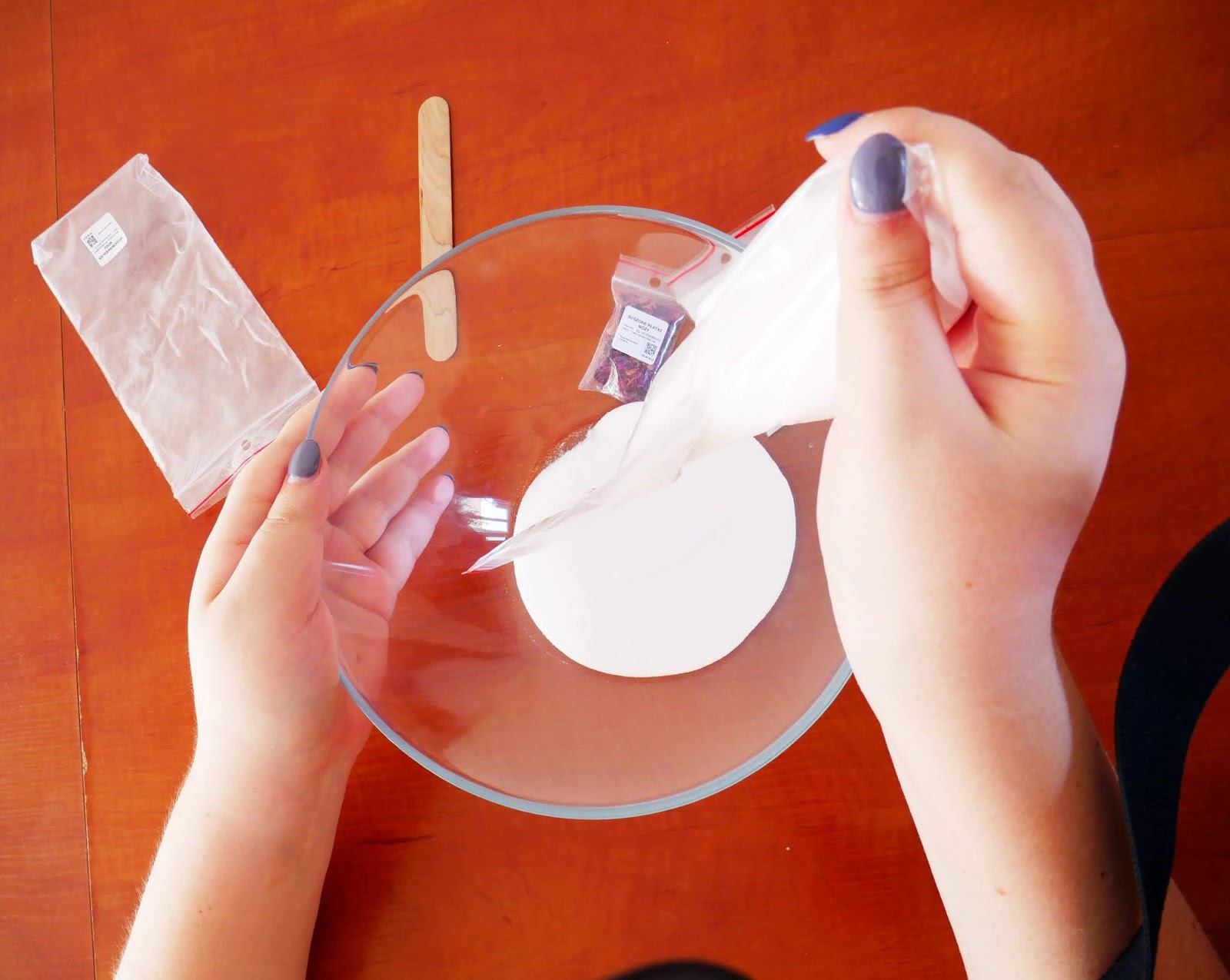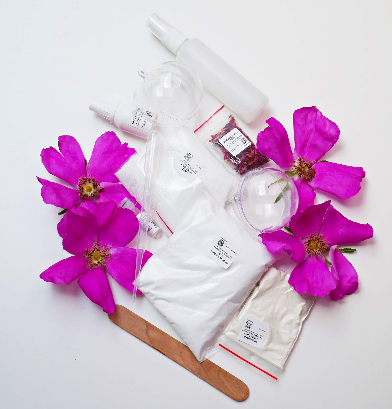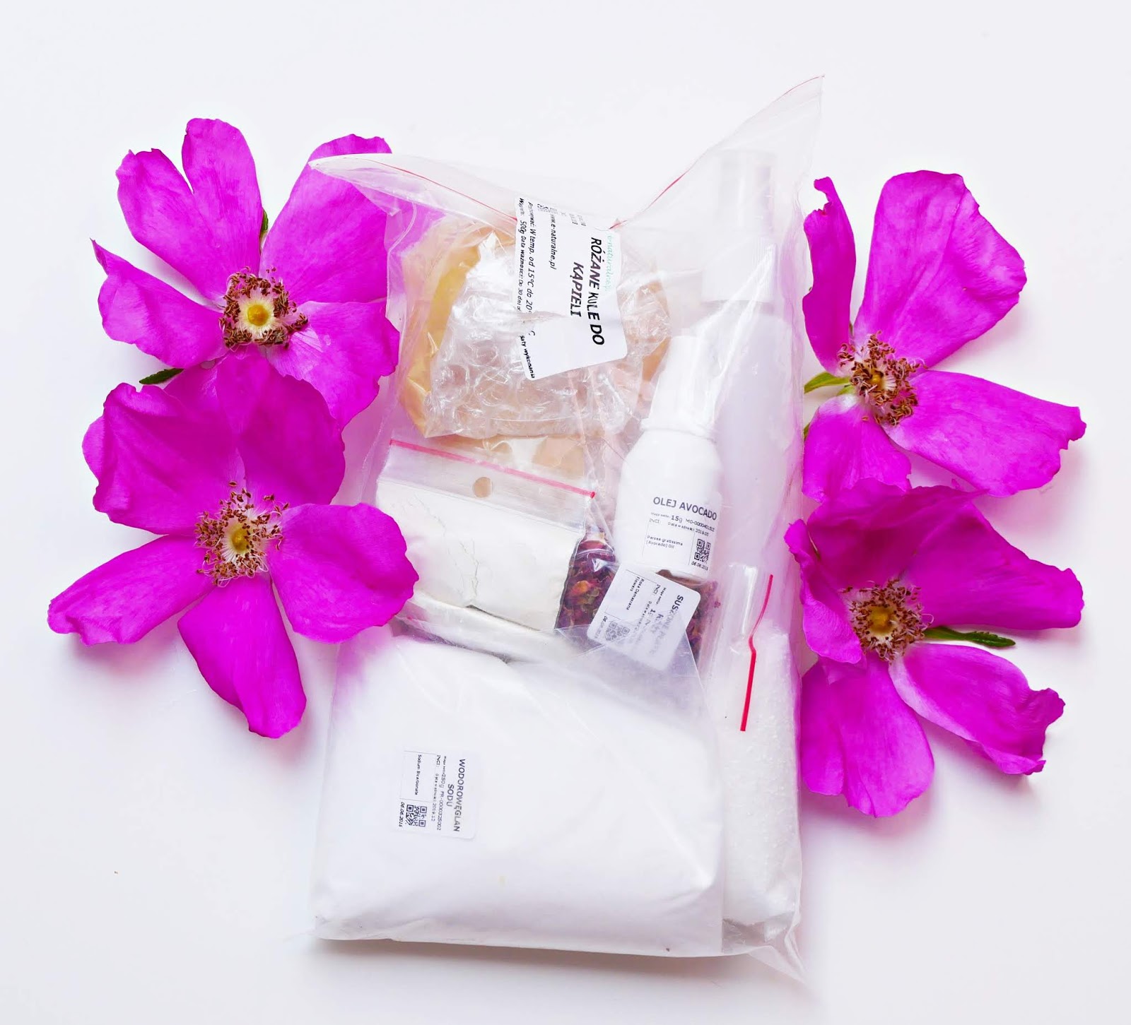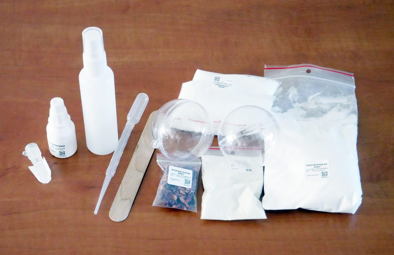 1. Zanim przejdziemy do tworzenia kuli, najpierw należy sprawdzić, czy otrzymany zestaw jest kompletny oraz przygotować dodatkowe składniki, które będą niezbędne podczas tworzenia. Może to być woda lub dowolny hydrolat. Ja nie miałam hydrolatu pod ręką, wiec tym razem wybrałam wodę.