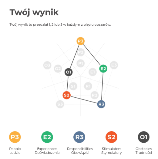 Doświadczenia – obszar ten pozwala sprawdzić, jak bardzo otwarty jesteś na różnego rodzaju doświadczenia. Zarówno te wewnętrzne (jak wyobrażenia, emocje i uczucia, wyznawane zasady i wartości), jak i te zewnętrzne (piękno i estetyka, podejmowane aktywności oraz nowe idee).
