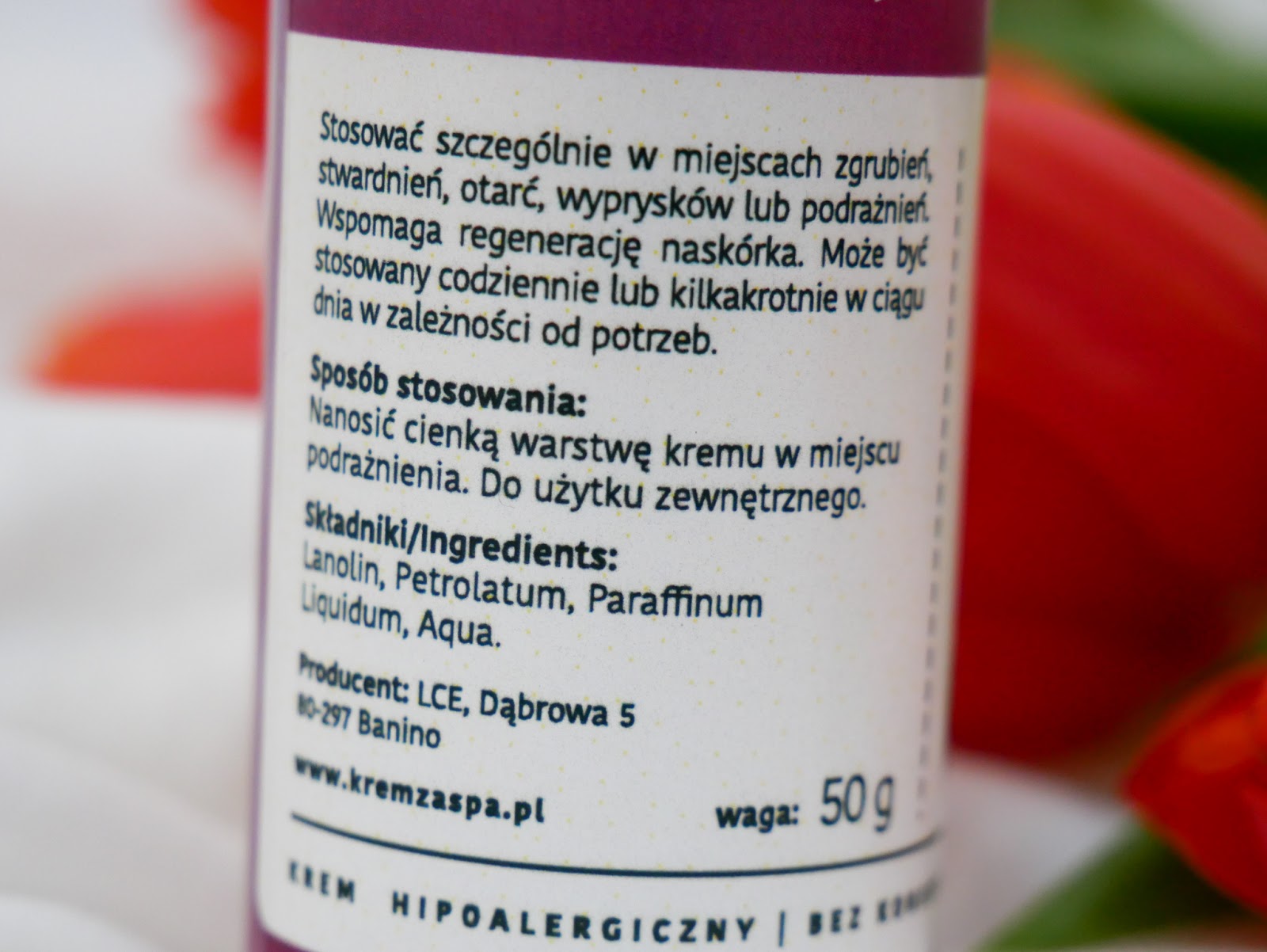 Krem Zaspa soft skin przeznaczony jest do skóry suchej i skłonnej do podrażnień. Jest niezastąpiony w pielęgnacji mojej suchej i problematycznej skóry. Gdy pojawi się zaczerwienienie albo zmiana skórna, zawsze mogę na niego liczyć. Krem w przeciwieństwie do balsamów ma mocno odżywczą formułę, typowa dla maści. Po zaaplikowaniu odpowiedniej ilości na skórę trzeba użyć trochę siły, aby kosmetyk dokładnie rozprowadzić. Krem dzięki swojej odżywczej formule jest bardzo wydajny. Pierwsze efekty jego stosowania widoczne są już po pierwszym użyciu. W zależności od zapotrzebowania można używać go do wysuszonych i spękanych pięt, kolan i łokci lub do pielęgnacji całego ciała. Krem dogłębnie nawilża i natłuszcza skórę. Wspomaga barierę hydrolipidową skóry, a tym samym zapobiega nadmiernej utracie wody z dalszych warstw naskórka. Koi i łagodzi wysuszoną, podrażnioną i zaczerwienioną skórę. Wspomaga procesy ochronne oraz zapobiega powstawaniu kolejnych dolegliwości. Pozostawia na jej powierzchni delikatny filtr ochronny, który zapobiega nadmiernemu przesuszaniu i łuszczeniu się naskórka. Kosmetyk chroni skórę przed negatywnym wpływem czynników zewnętrznych, w tym mrozu, czy promieniowania UV. Doskonale radzi sobie także ze wszelkiego rodzaju niedoskonałościami. Ja stosuję go raz dziennie i skóra cały czas jest bardzo przyjemna w dotyku. W razie zaczerwienienia, czy liszajów zazwyczaj powtarzam aplikację kilka razy. Krem pozostawia skórę miękką, elastyczną i jedwabiście gładką. Widać, że momentalnie odzyskuje swój zdrowy i promienny wygląd.
