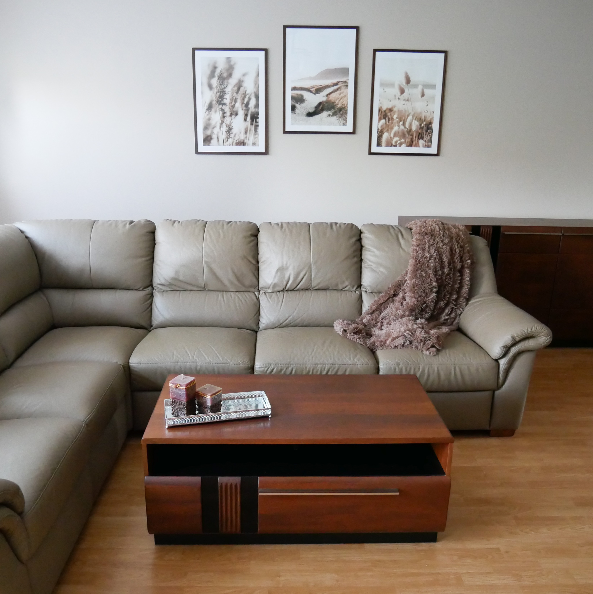 Salon to miejsce, gdzie spędzamy wspólnie najwięcej czasu. Jest takim wewnętrznym centrum dowodzenia, gdzie poruszamy istotne w danym momencie tematy. Dom jakby nie było ma już 17 lat. Kiedy się sprowadziliśmy, większość rzeczy była robiona etapowo. Salon jako ostatni został odmalowany i urządzony dopiero w tym roku. Salon ma dość dużą powierzchnię. Jest z niego widok na otwartą kuchnię i hol. Przeważają w nim przede wszystkim brązy, podobnie z resztą jak w kuchni. Może jedynie meble są innego koloru. Ponieważ spędzamy w nim wiele czasu, musiał zostać urządzony tak, aby było przytulnie. Kiedy meble stanęły na swoich miejscach, a ściany zyskały piękny kolor, zauważyliśmy, że nadal czegoś tu brakuje. Jako że już wcześniej słyszałam o stronie Poster Store, pomyślałam, że plakaty z ich strony byłby idealnym dodatkiem, który wprowadzałby odrobinę nowoczesności. W pomieszczeniu królują brązy, dlatego szukaliśmy ramek i plakatów, które będą pasowały do tego wnętrza. Wybór padł na trzy plakaty ( Plakat Trawa Trzcinowa, Plakat Trawa Plażowa i Plakat Piaszczyste Wydmy), które nie tylko doskonale pasują do tego wnętrza, ale również tworzą ze sobą spójną całość. Do wyboru jest kilka rozmiarów obrazów. Zdecydowaliśmy się na ten pośredni i do tego dobraliśmy przepiękne, drewniane ramki w kolorze mebli. Od razu, kiedy zawisły na ścianie wiedziałam, że to był dobry wybór. W estetyczny sposób wypełniają wnętrze i nadają mu klimat. Całość wygląda po prostu przepięknie!