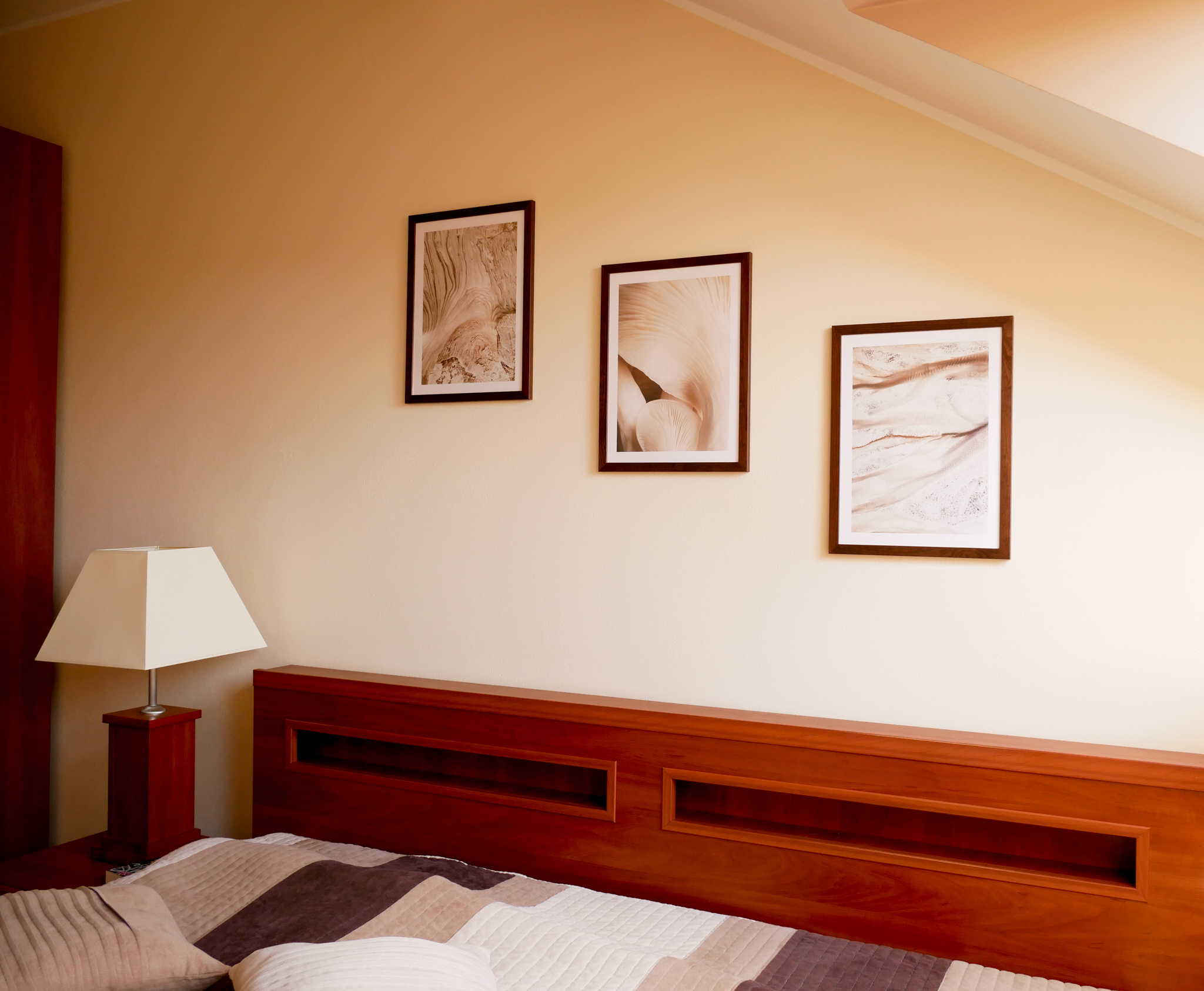 Sypialnia to również bardzo szczególne miejsce. Powinniśmy czuć się w niej komfortowo. W końcu to miejsce, gdzie odpoczywamy i zbieramy siły do kolejnych wyzwań, które czekają na nas każdego dnia. Sypialnia rodziców jest urządzona w bardzo podobny sposób, jak salon, jednak królują tam nieco jaśniejsze kolory. Jasne ściany i proste, drewniane meble doskonale wyglądają. Myślę, że to miejsce, w którym każdy chętnie spędzałby swój wolny czas. Rodzice postanowili dodać jeszcze parę ostatnich szlifów. Podczas wybierania plakatów do salonu, wpadły im w oko przepiękne plakaty pasujące do kolorystyki całego pomieszczenia. Wpadły im w oko przepiękne i bardzo oryginalne formy. Są to takie plakaty, w których w zależności od interpretacji, każdy może zobaczyć coś innego (Plakat Miękkie Grzyby, Plakat Kanion i Plakat Rock Formations). Rodzice co do ich wyboru nie mieli żadnych wątpliwości. Sama, kiedy na nie patrzę, od razu jestem bardziej spokojna i wyciszona. Sprawiają, że pomieszczenie jest bardzo przytulne. Z łatwością można się w nim wyciszyć i odpocząć. W tym wnętrzu czuć spokój i harmonię. Tym razem plakaty były nieco mniejsze. Do nich dobrali jeszcze ramki w tym samym kolorze, co do salonu. Sypialnia wygląda przepięknie! W takim pomieszczeniu odpoczynek, to czysta przyjemność!