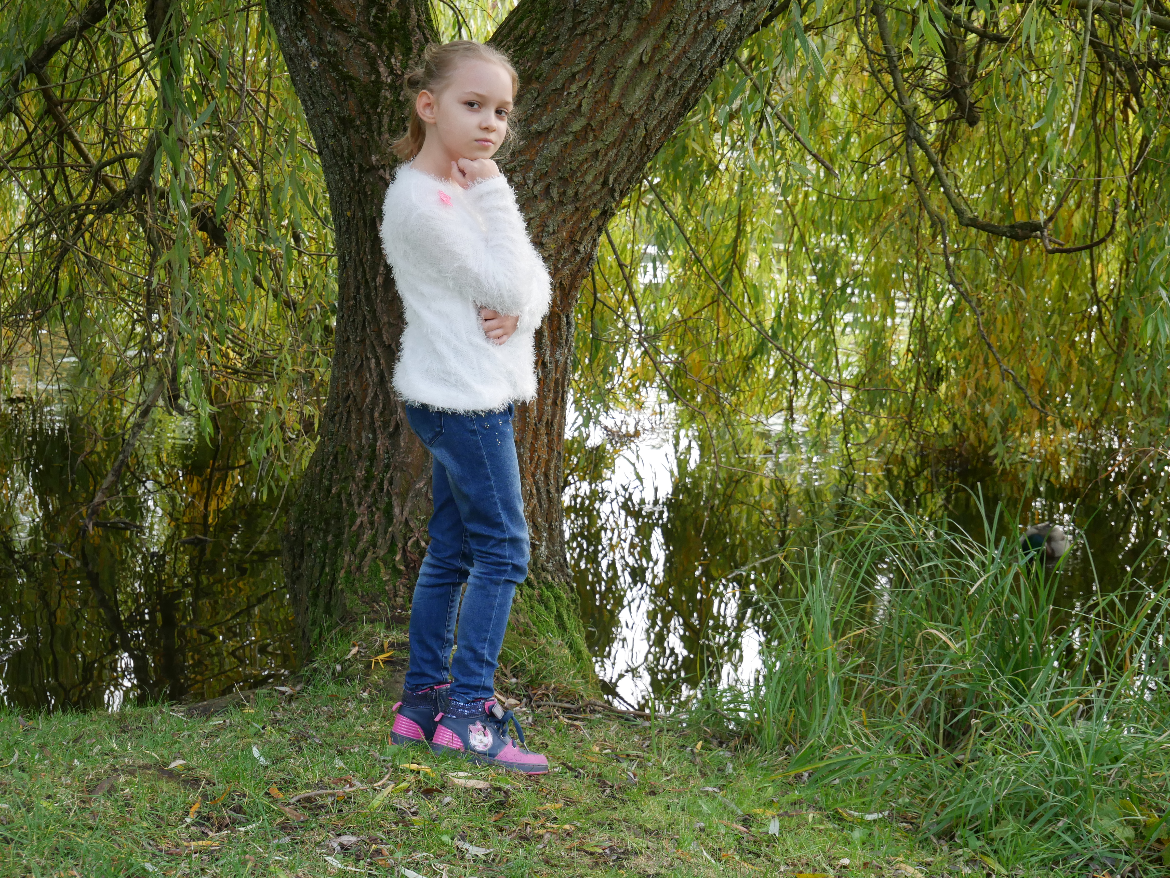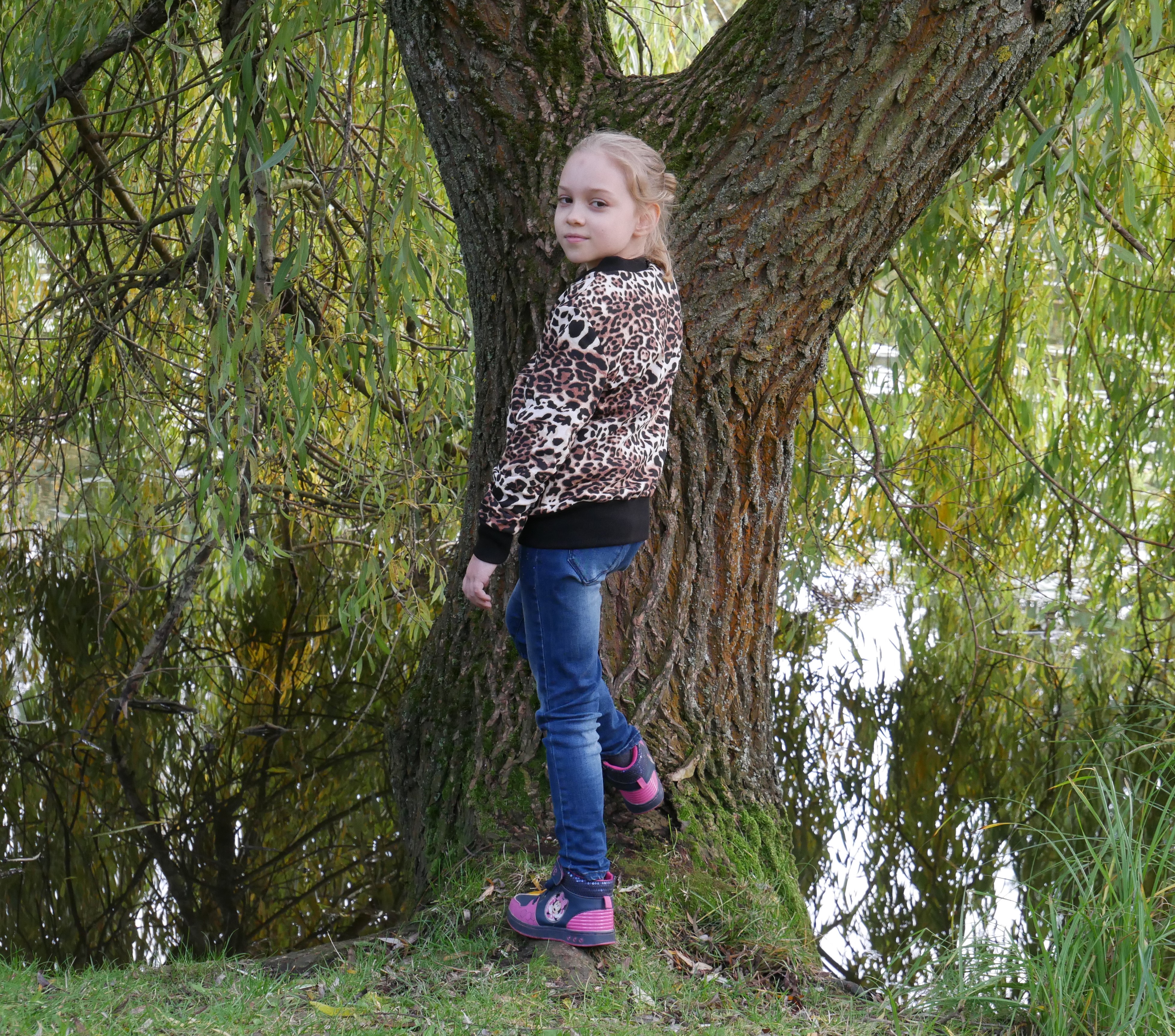 Panterka to bardzo modny motyw, także w modzie dziecięcej. Kiedy zobaczyłam tę piękną bluzę w panterkę, wiedziałam, że musi znaleźć się w garderobie Hani. Ma ona dosyć nietypowy krój. Jest krótsza i posiada ściągacz na dole oraz na zakończeniu rękawów. Zapinana jest na zamek. Doskonale wygląda jako zwykła bluza, kiedy pod spodem jest bluzeczka z krótkim bądź z długim rękawem. Jednak równie dobrze sprawdza się jako top przy dłuższych tunikach. Hania czuje się w niej rewelacyjnie, chociaż warto wspomnieć, że tkanina jest ciut sztywniejsza niż zwykła bawełna. Hania jednak wygląda w niej szałowo!