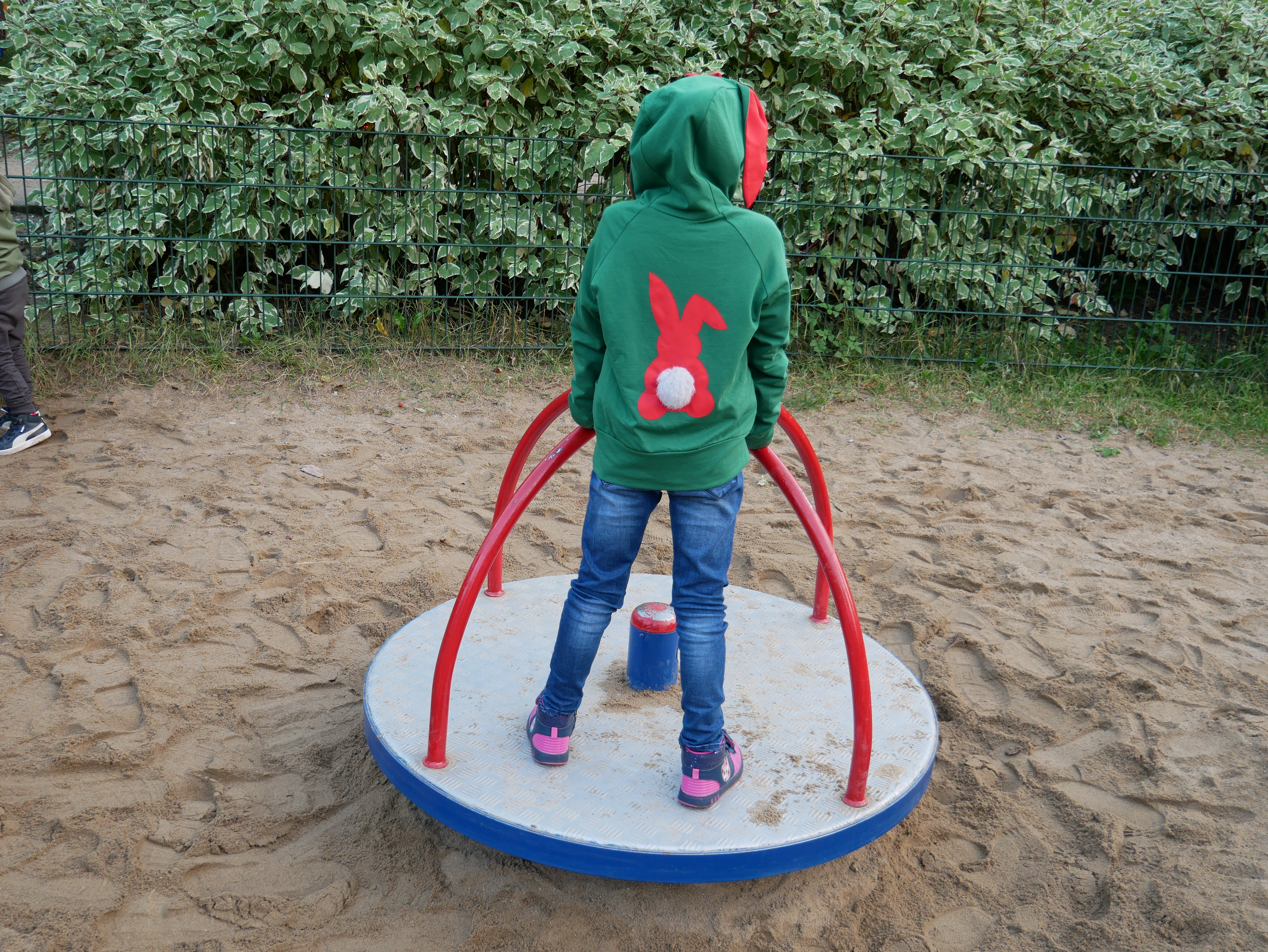 Na koniec pozwoliłam sobie zostawić perełkę, czyli niesamowicie oryginalną bluzę, której nie znajdziecie nigdzie indziej. Podobnie jak wszystkie wymienione wcześniej, ta również jest miękka i bardzo ciepła. Zakładając ją, dziecko w mgnieniu oka zmieni się w kolorowego królika. Do kaptura zostały przyszyte długie królicze uszy, a z tyłu doszyty jest szary, puszysty ogonek. Hania wygląda w niej po prostu genialnie!