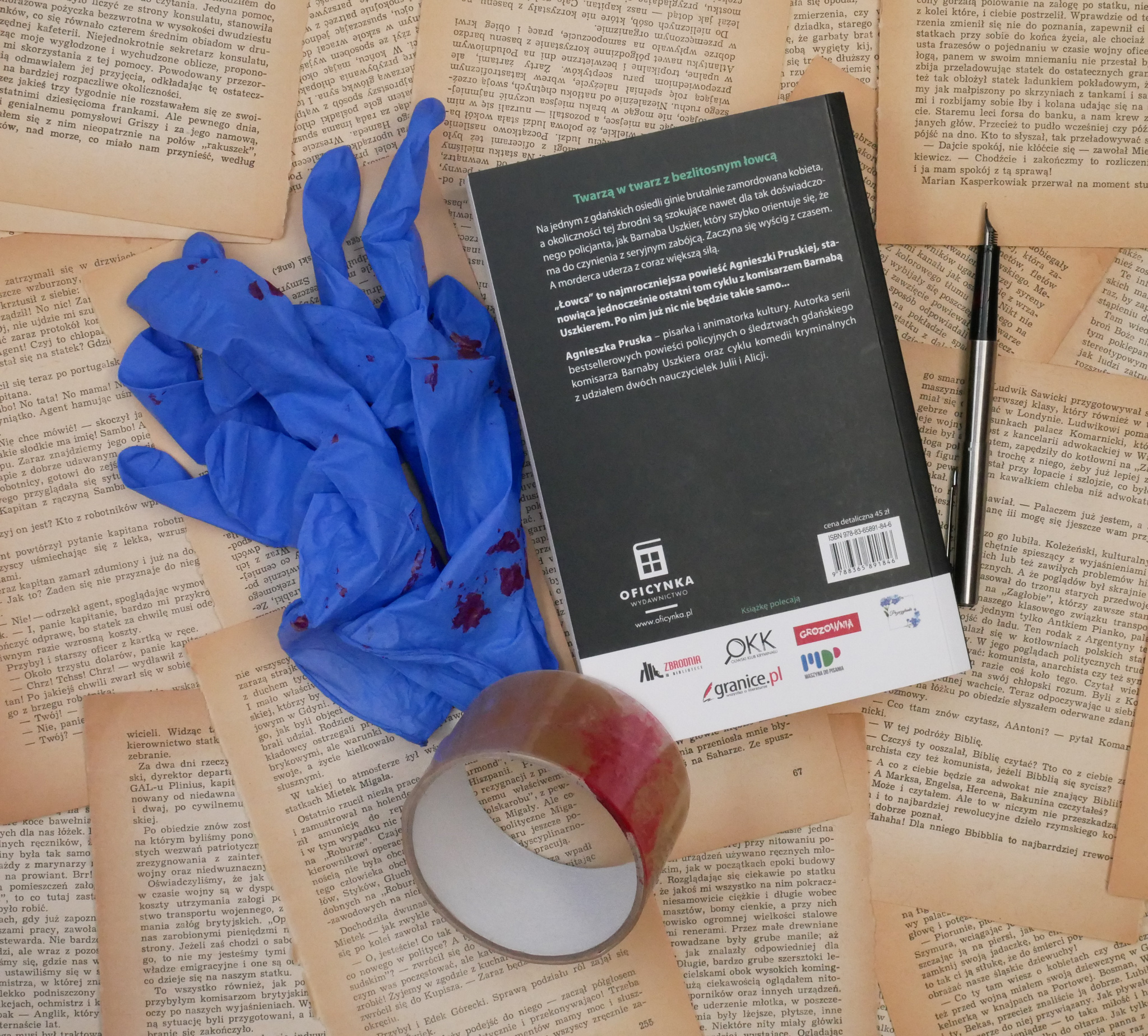Technicy, którzy są na miejscu zbrodni, szukają nawet najdrobniejszego śladu, który pomoże zidentyfikować mordercą. Barnaba Uszkier ze swoją ekipą szuka jakiegokolwiek punktu zaczepienia. Mimo że jest to policjant z długoletnim doświadczeniem, to widok z miejsca zbrodni jest dla niego przerażający. Zdaje sobie sprawę, że przed nim trudny i pracowity czas. Musi jak najszybciej znaleźć jakiś ślad, który pozwoli mu dotrzeć do mordercy. Nadkomisarz przeprowadza wiele rozmów z sąsiadami oraz bliskimi ofiary, niestety, nie wnoszą one nic nowego do sprawy. Sprawca i jest bardzo sprytny i nie pozostawia na miejscu zbrodni śladów. Grupa dochodzeniowa bada wszelkie możliwe poszlaki. 15 dni później na osiedlu willowym w Pruszczu Gdańskim ginie kolejna kobieta. Tym razem to żona emerytowanego komisarza, Marka Stanisławskiego. Sposób zabójstwa jest taki sam. Teraz nadkomisarz Uszkier i jego ekipa wiedzą, że mają do czynienia z seryjnym mordercą. Sprawy są bardzo trudne i rozwojowe. Policjant wie, że musi bardzo szybko działać, bo morderca na pewno obserwuje już kolejną ofiarę. Dodatkowo sprawa staje się jeszcze trudniejsza, gdy włącza się do niej mąż ostatniej ofiary. Emerytowany policjant sam na własną rękę chce złapać mordercę żony, ale nie zdaje sobie sprawy, na jak trudnego przeciwnika może natrafić. Zataja wiele informacji przed Uszkierem, nie zdaję sobie sprawę, że może to przypłacić życiem. Nadkomisarz wraz ze swoim zespołem wnikliwie analizuje nawet najdrobniejsze szczegóły na miejscu zbrodni. W śledztwo zaangażowani są nie tylko policjanci, ale również prokurator i doświadczony psycholog, który tworzy portret psychologiczny mordercy. Uszkier coraz bardziej zatraca się w pracy, ale stara się, by rodzina nie została zepchnięta na dalszy plan. Stara się znaleźć czas dla żony, synów i oczywiście przyjaciela na czterech łapach – Tuśki. To podczas spaceru z nią stara się zdobyć więcej informacji o pierwszej ofierze i opracować nowy plan działania. Myślę, że na tym zakończę swoją opowieść o książce i pozostawię Was z pytaniami. Co łączyło ofiary? Czy uda się nadkomisarzowi przeszkodzić mordercy w popełnieniu kolejnej zbrodni? Oczywiście, aby odpowiedzieć sobie na te pytania, trzeba przeczytać rewelacyjną powieść kryminalną –„Łowcę” Agnieszki Pruskiej.