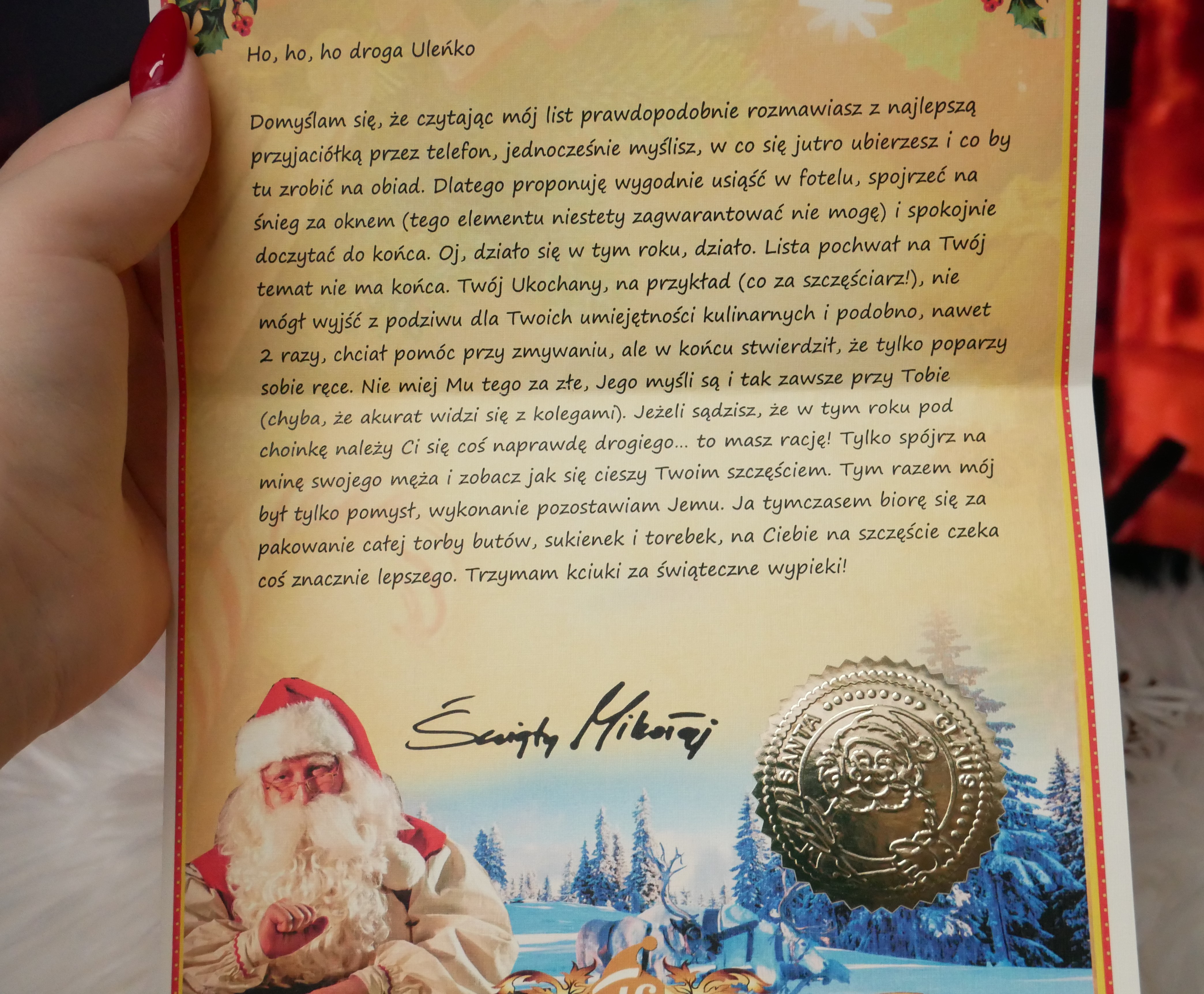 Po upływie zaledwie kilku godzin na skrzynkę mailową przychodzi gotowy film. Muszę, przyznać, że wszystko jest doskonale wykonane. Zadbali o każdy szczegół i wszystkie informacje idealnie wpasowali w film. Jest bardzo profesjonalnie wykonany i wygląda naprawdę autentycznie. Kiedy po raz pierwszy obejrzałam zamówiony przeze mnie film, byłam nim zachwycona. Wiedziałam, że mama ucieszy się z takiej niespodzianki. Jednak miałam dopiero sam film, więc postanowiłam poczekać, aż przyjdzie do mamy list od Świętego Mikołaja. Po kilku dniach mama odebrała złotą kopertę. Nie wiedziała, co jest w środku, a że na kopercie widniało jej imię i nazwisko. Jaka była jej radość, kiedy zobaczyła, że to list od Świętego Mikołaja. Zupełnie się go nie spodziewała. Kiedy czytała jego treść, która doskonale pokazywała, jak jest dla nas ważna, aż uroniła łzę. Przeczytała całość, obejrzała certyfikat i mocno nas przytuliła. Na koniec pokazałam jej film od Świętego Mikołaja, w którym również podkreśliłam, jaka jest dla nas ważna. Jest bardzo wyjątkową osobą i obie kochamy ją całym sercem. Takie uczucia, jakie wzbudził w mamie film wraz z listem, są po prostu bezcenne!
