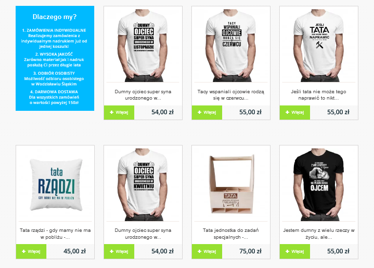 To na co warto zwrócić uwagę to jakość wykonania, ponieważ jest ona naprawdę na wysokim poziomie. Koszulki wykonane są w 100% z bawełny. Nadruk, który się na nich znajduje jest doskonale wykonany. Widać, że firma podchodzi do tego bardzo profesjonalnie. Na stronie mamy do wyboru przeróżne koszulki z nadrukiem, spośród których na pewno każdy znajdzie coś dla siebie. Znaleźć można wiele modeli zarówno damskich, jak i męskich. Doskonała obsługa oraz szybka wysyłka sprawiają, że w takim sklepie zakupy robi się po prostu z przyjemnością!