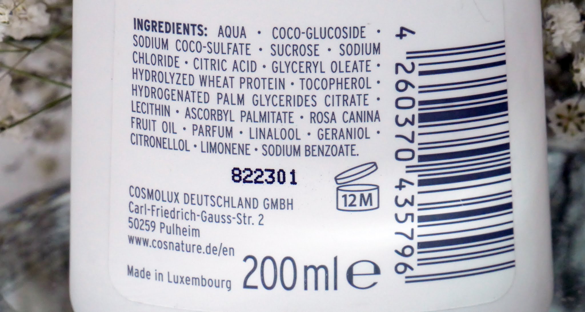Skład: aqua (woda), coco-glucoside (emulgator), sodium coco-sulfate (półsyntetyczny detergent/emulgator pochodzenia roślinnego), sucrose (sacharoza pełni funkcję nawilżającą, zapobiega nadmiernej utracie wody z naskórka), sodium chloride (substancja wypełniająca), citric acid (kwsek cytrynowy jest regulatorem pH, a ponadto ma właściwości złuszczające, jednak to właśnie ta substancja może podrażniać), glyceryl oleate (emulgator odpowiadający za tworzenie się warstwy ochronnej na powierzchni skóry, która zapobiega nadmiernej utracie wody), hydrolyzed wheat protein (hydrolizowane proteiny pszenicy odpowiadają za prawidłowy poziom nawilżenia włosów i skóry głowy), parfum (substancja zapachowa), linalol (substancja zapachowa, potencjalnie alergizująca), geraniol (substancja zapachowa), citronellol (substancja zapachowa, potencjalnie alergizująca), limonene substancja zapachowa, potencjalnie uczulająca), rosa canina fruit oil (olej różany odpowiada za regeneracje struktury włosa), tocopherol (witamina E wzmacnia barierę naskórkową, a tym samym poprawia nawilżenie skóry), hydrogenated palm glycerides citrate (emulgator, substancja myjąca i kondycjonująca), lecithin (emulgator, substancja kondycjonująca, która wpływa na poziom nawilżenia skóry), ascorbyl palmitate (przeciwutleniacz, odpowiada za złuszczanie martwego naskórka i regenerację skóry), sodium benzoate (substancja konserwująca potencjalnie alergizująca).